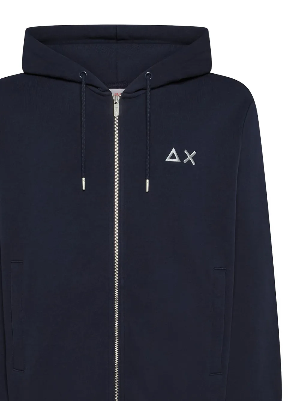 Темно-синий цвет, логотип, застежка на молнии, капюшон со шнурком, боковые прорезные карманы, длинные рукава