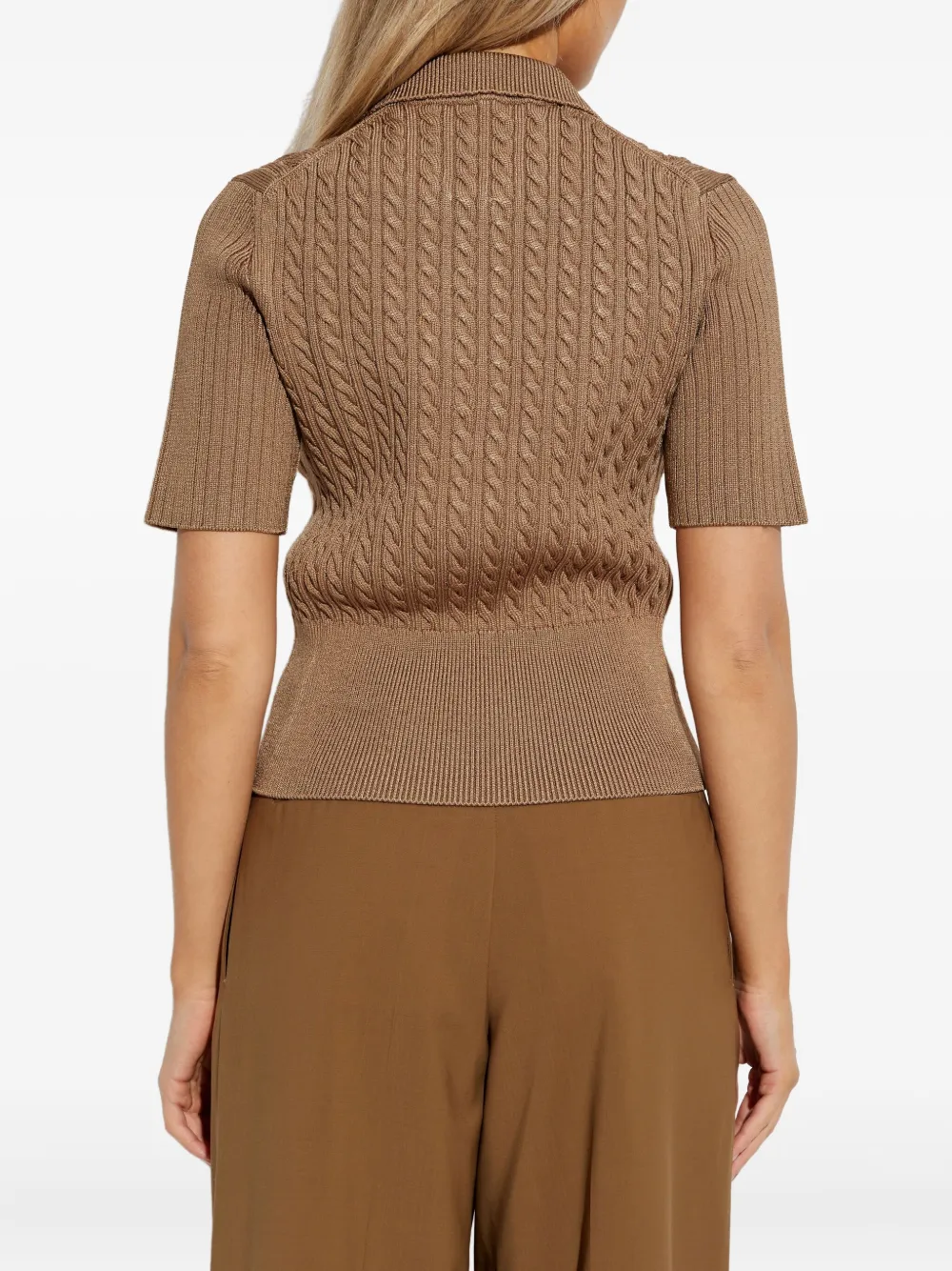 Светло-коричневый пуловер с косами, рубчатым подолом, короткими рукавами, застежкой на пуговицы и воротником поло