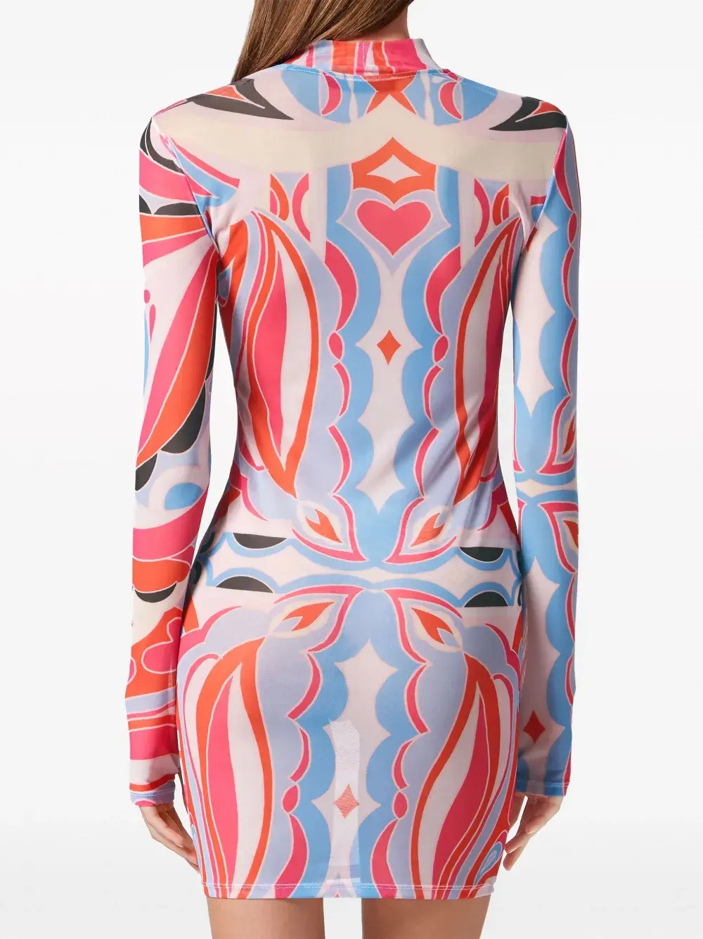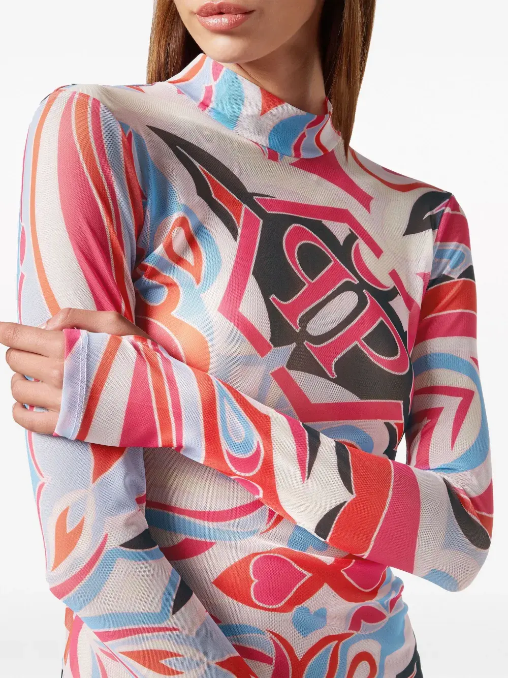 Разноцветный, эластичный материал, абстрактный принт, сплошной принт с логотипом, высокий воротник, длинные рукава, прямой подол и длина до бедер.