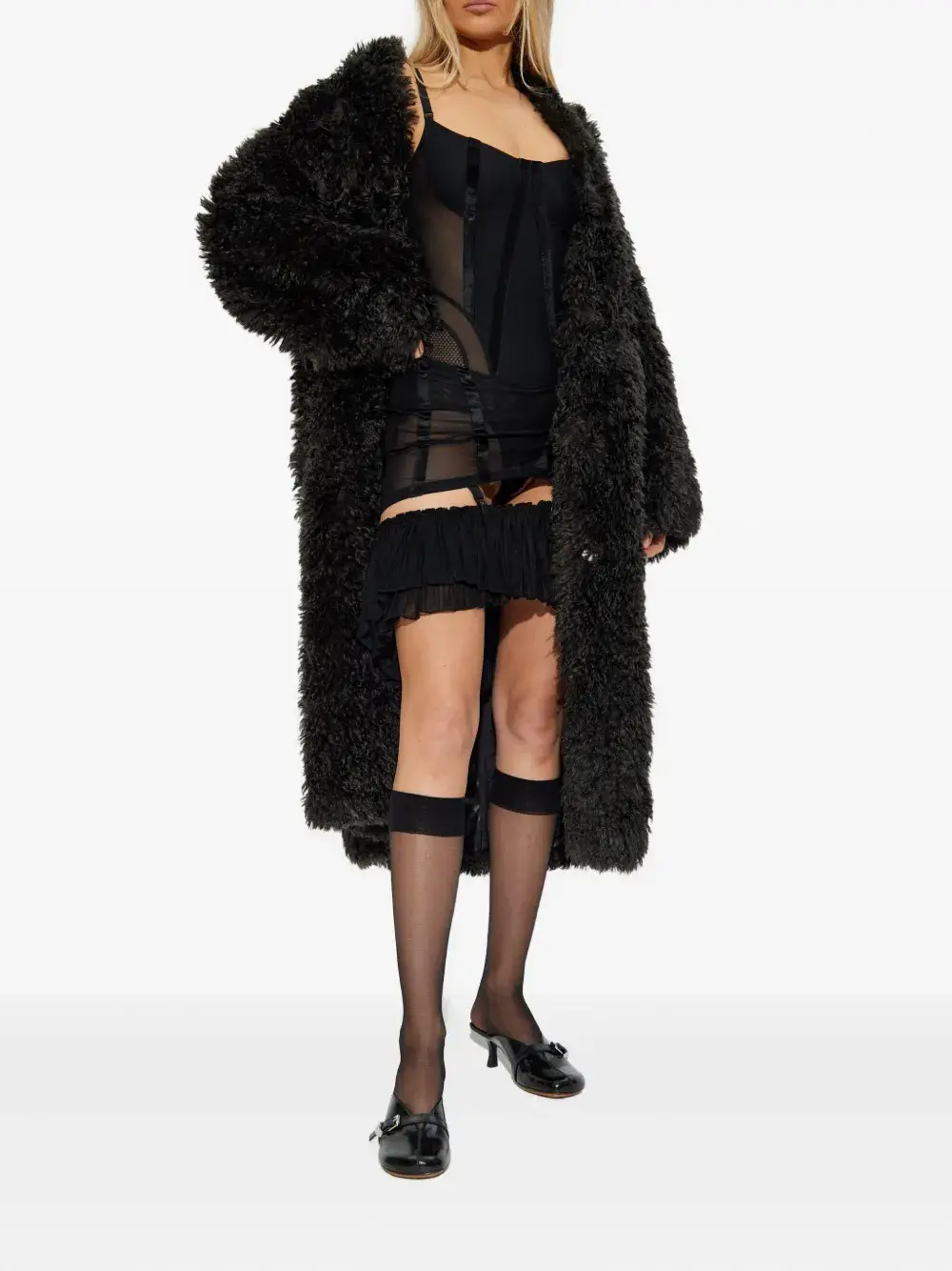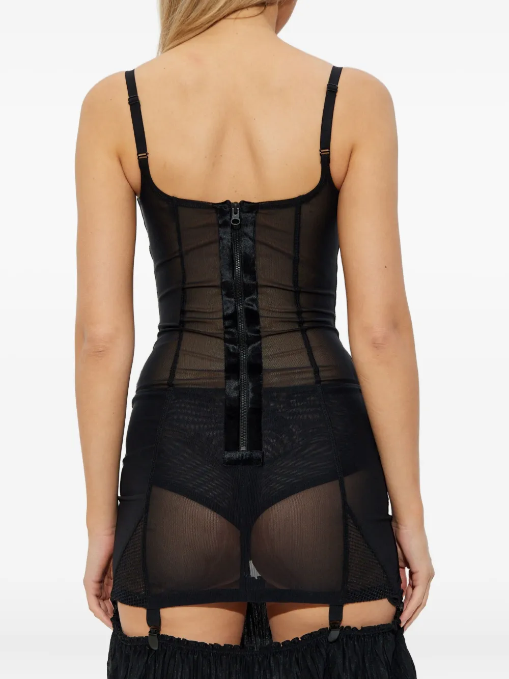 Черные подтяжки, плиссированная отделка рюшами, вставки из сетки, застежка-молния, подвязки