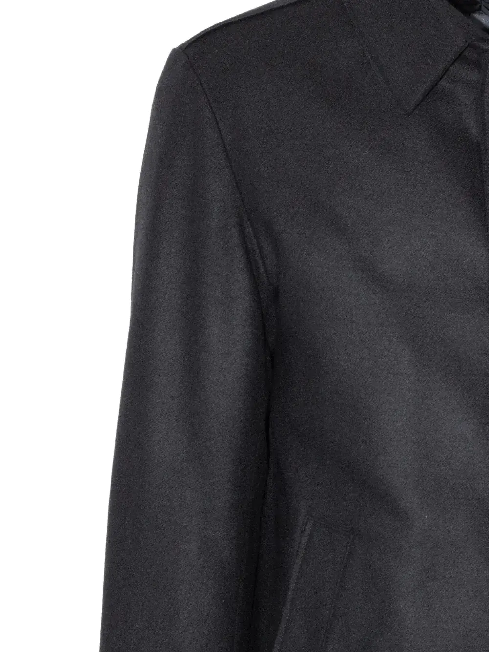 Черная рубашка с воротником, скрытая застежка, длинные рукава, прямой низ, прорезные карманы