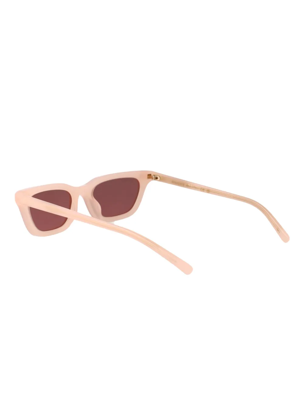 Светло-розовая оправа "кошачий глаз", детали с логотипом, тонированные линзы, носовые упоры. В комплекте идет защитный футляр.