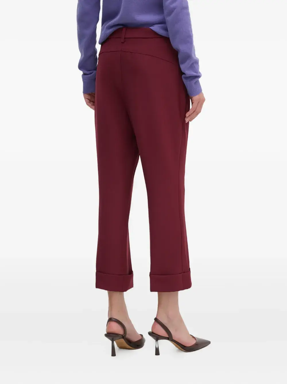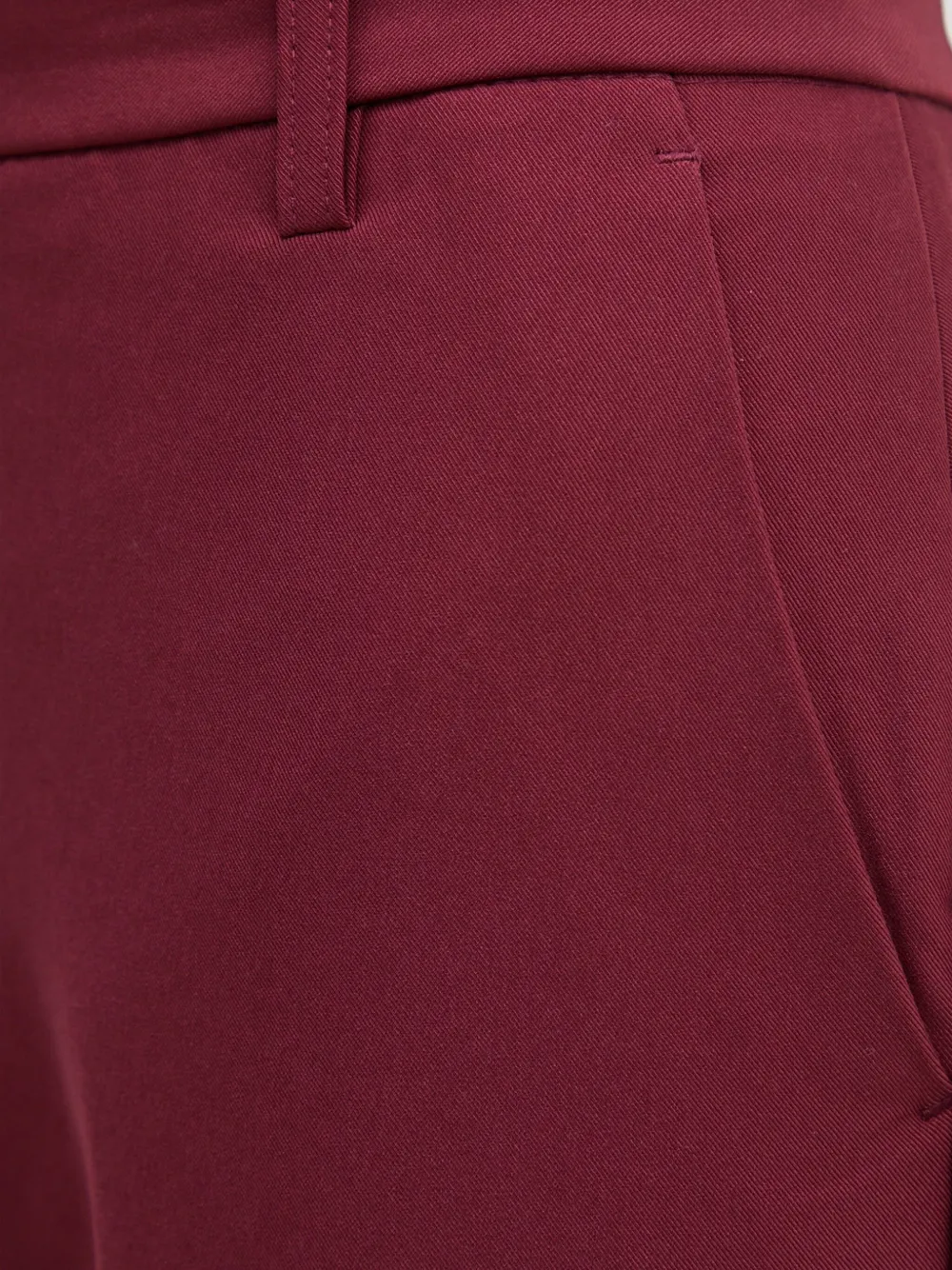 Бордовые шлевки для пояса, боковые карманы в швах, подогнутый край, потайная застежка