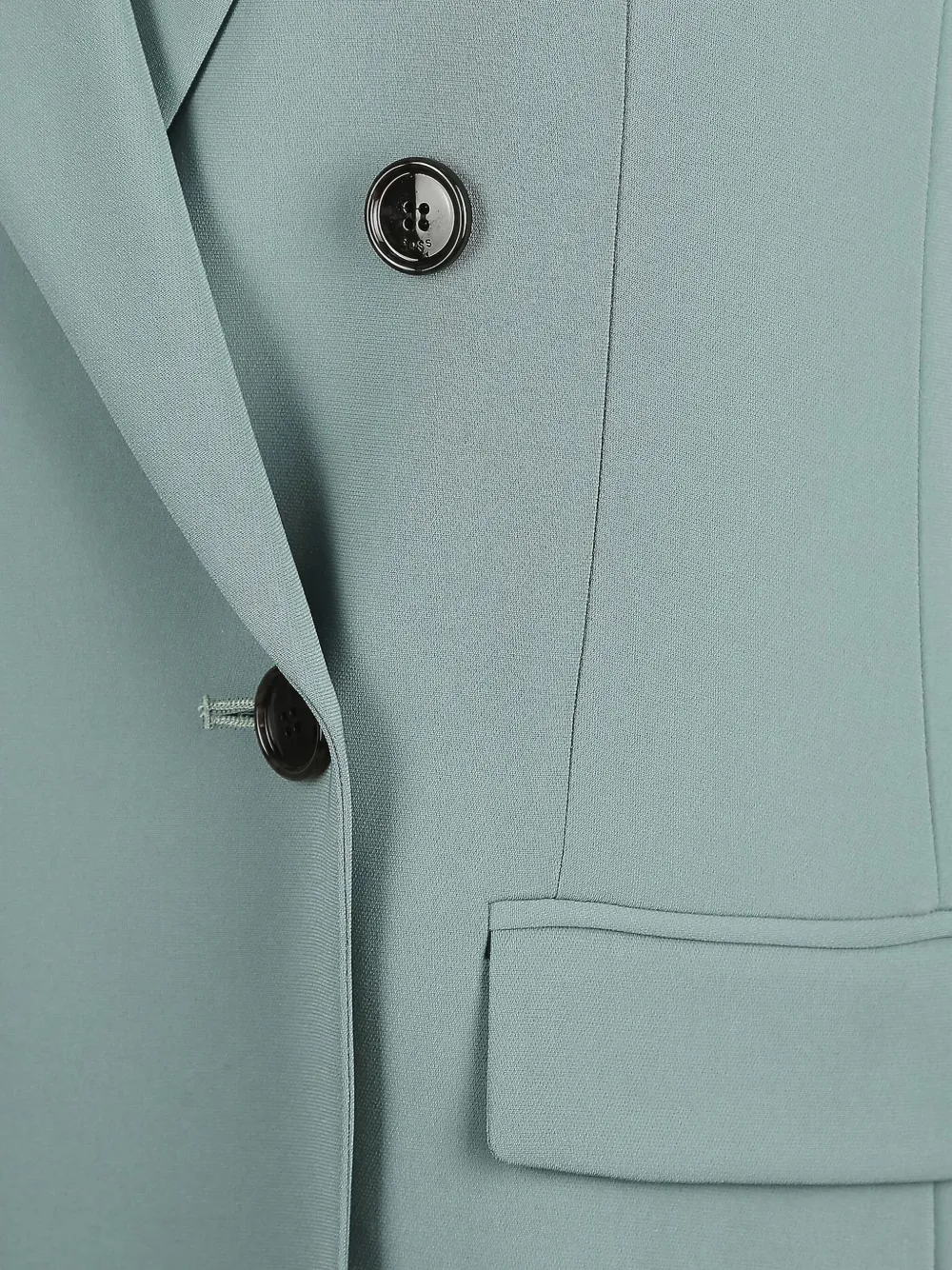 Зеленый двубортный пиджак с застежкой на пуговицы, лацканами с вырезом, клапанами на карманах и длинными рукавами