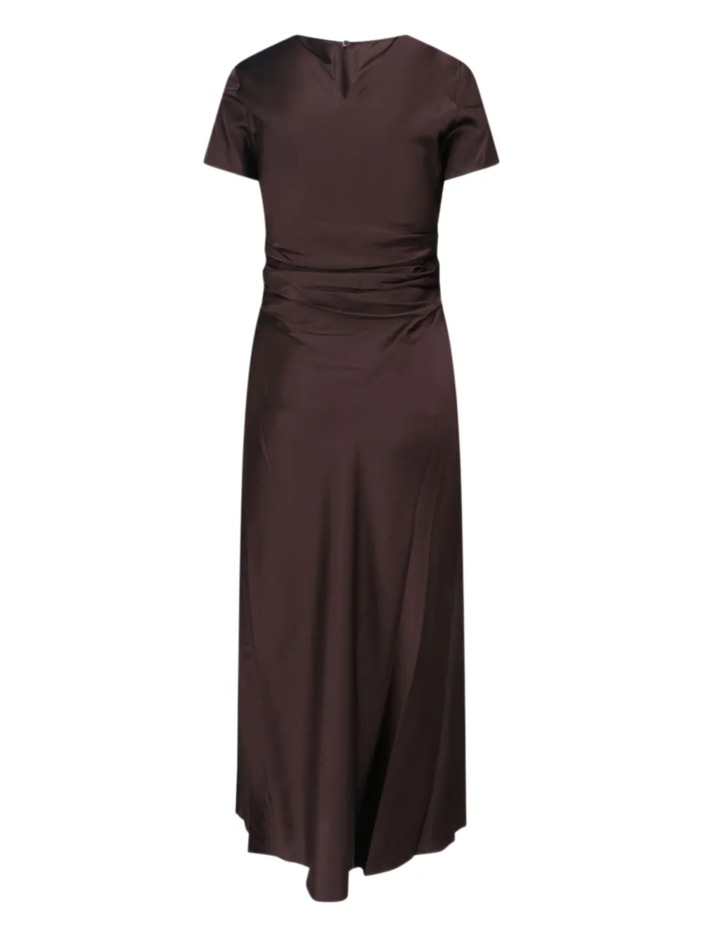 Коричневое платье с короткими рукавами, драпировкой, застежкой на пуговицы сзади, V-образным вырезом и длиной миди