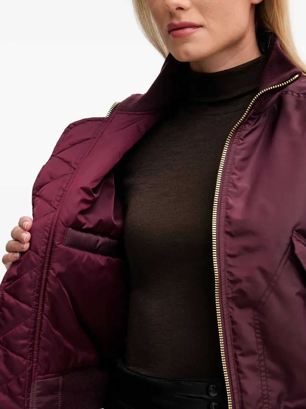 Бордовая застежка-молния, ребристые манжеты, высокий воротник, накладные карманы с клапанами, карман на рукаве на молнии