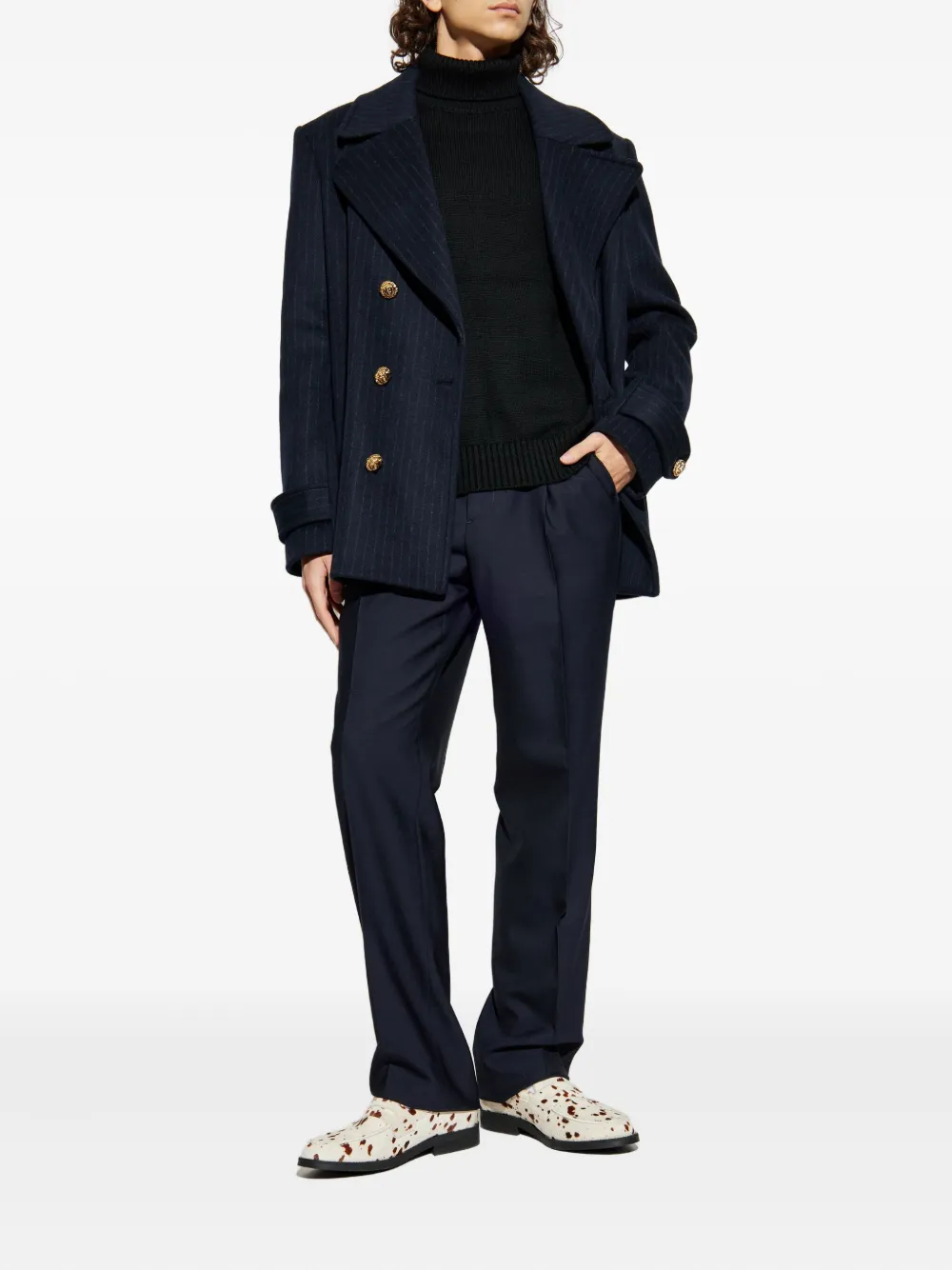 Темно-синий, отделка стрелками, шлевки для ремня, застежка на пуговицы, два боковых прорезных кармана, два задних кармана с листочкой, шерсть