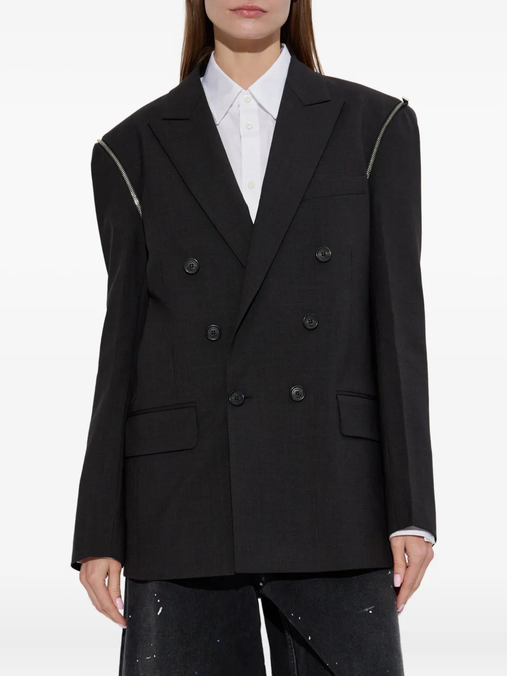 Черная шерсть мериноса, декоративные молнии, двубортная застежка на пуговицы, лацканы с острым концом, передние прорезные карманы с клапанами, длинные рукава