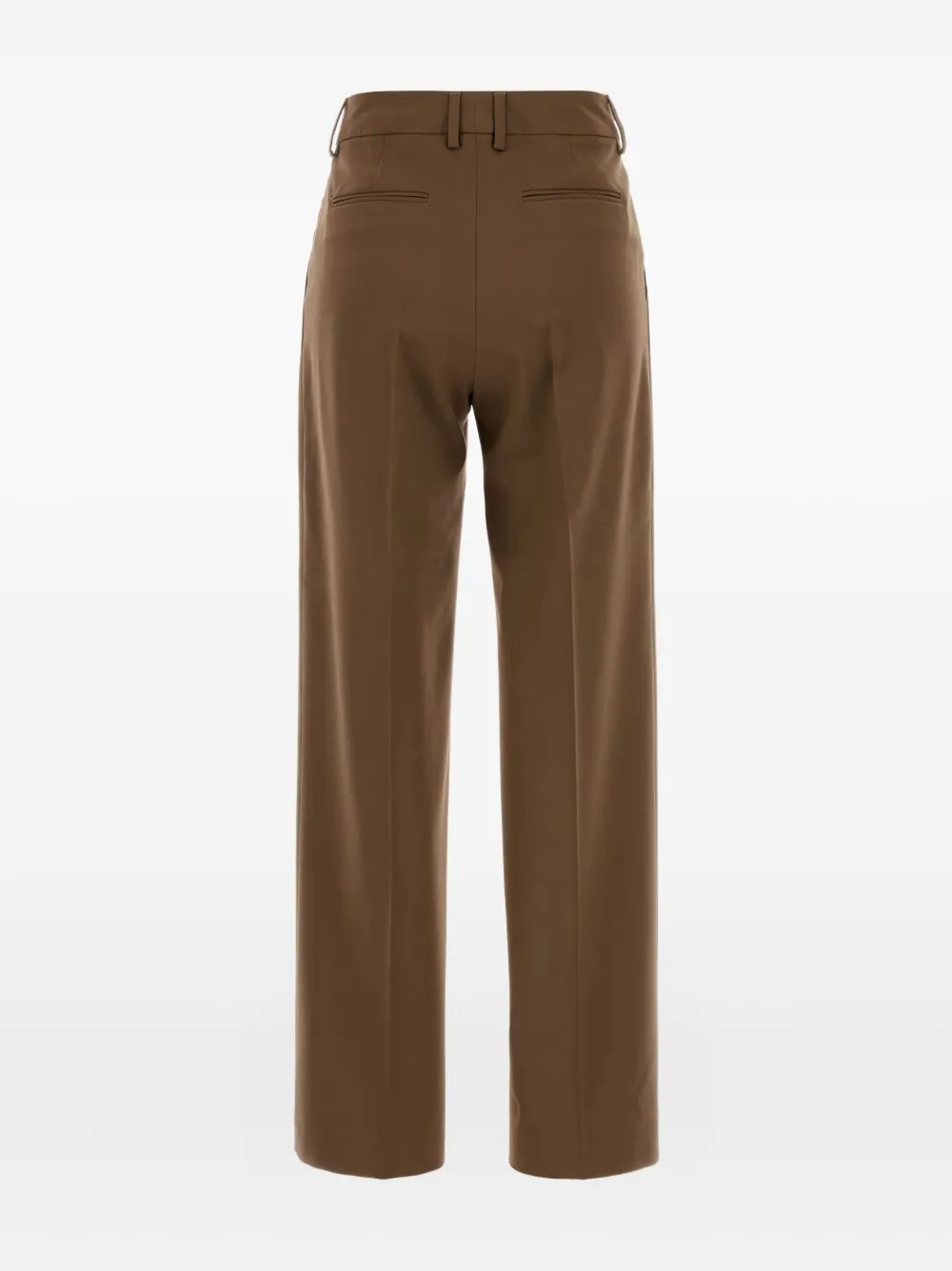 Грязно-коричневый цвет, шлевки для ремня, скрытая застежка, задний прорезной карман, заутюженные складки