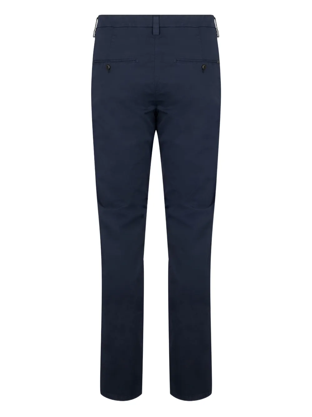 Темно-синие шлевки для ремня, застежка на пуговицы, боковые карманы с косым входом, задние прорезные карманы, логотип сзади