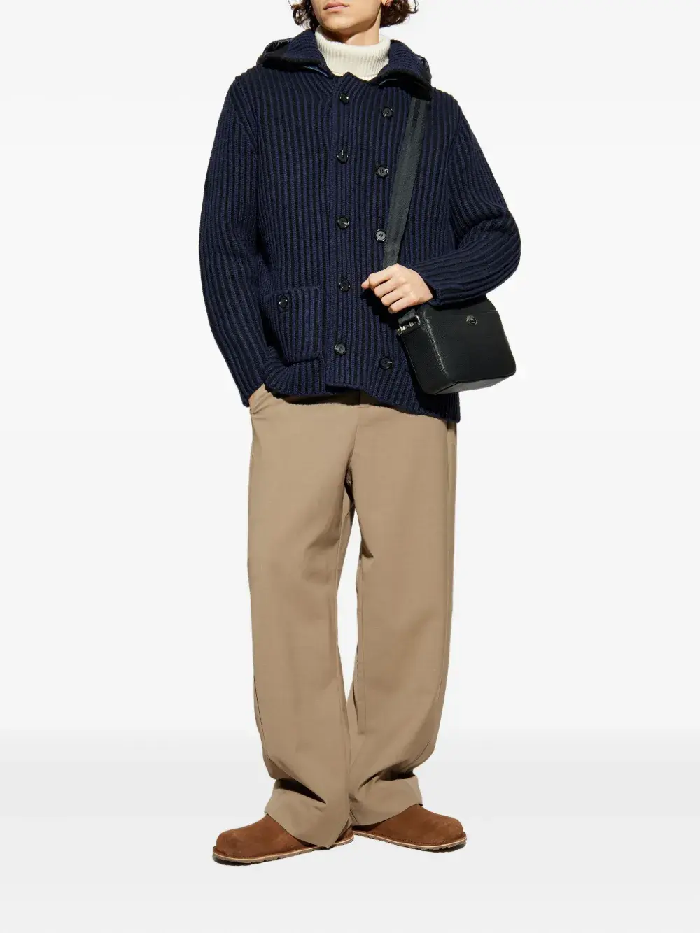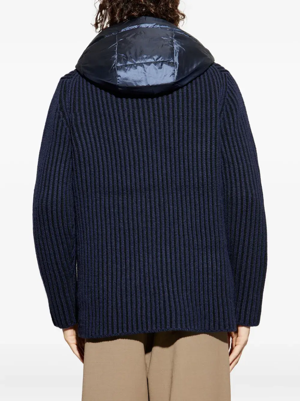 Синий в полоску, застежка на пуговицы, нагрудные карманы с клапанами, капюшон, двубортный