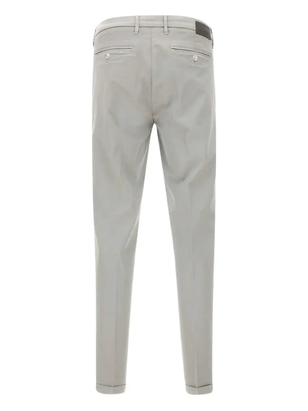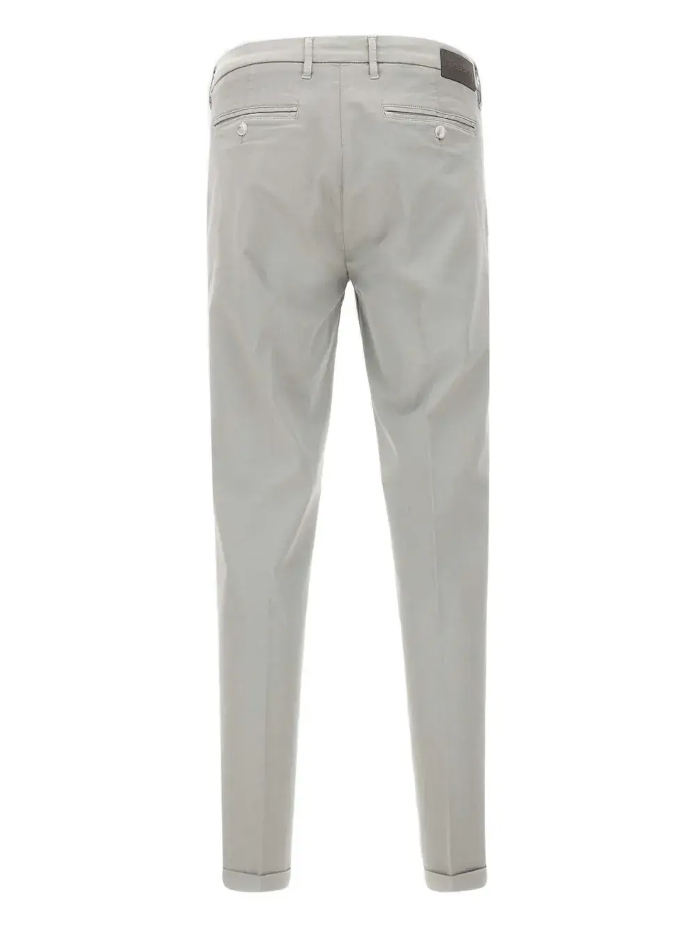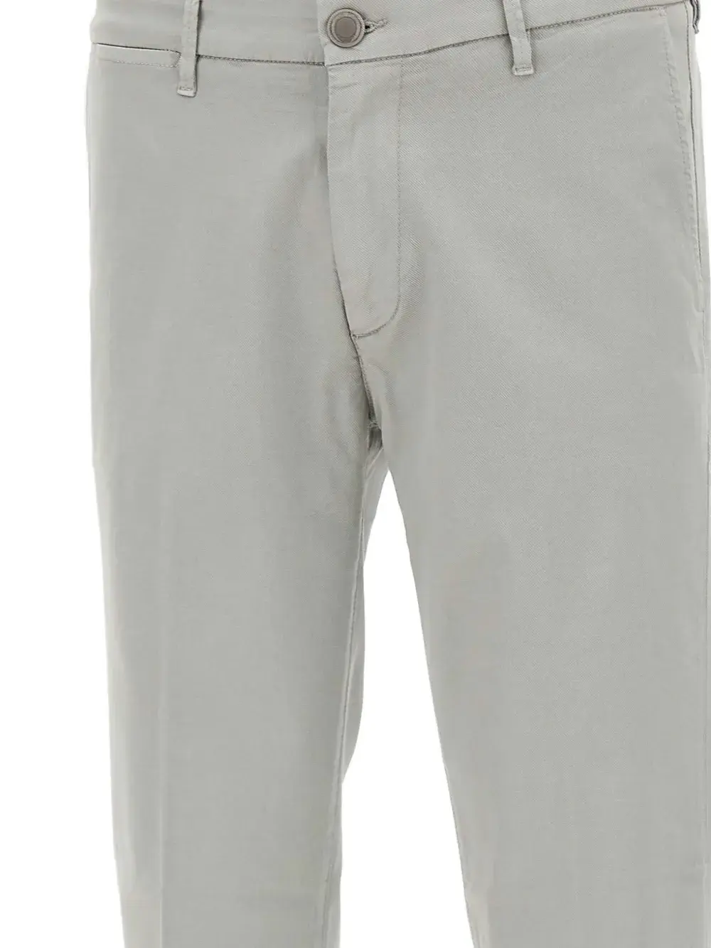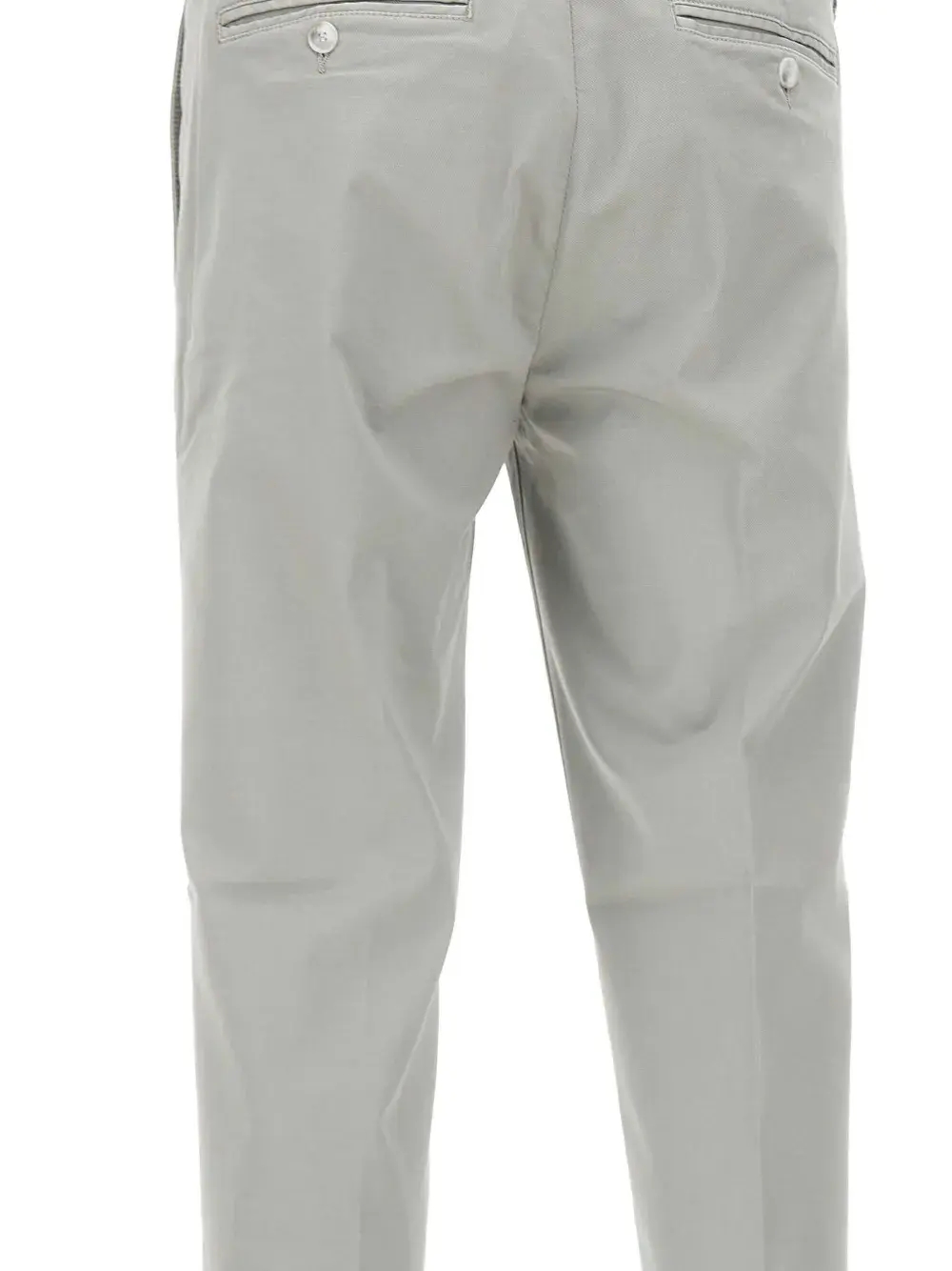 Светло-серый цвет, застежка на пуговицы, шлевки для ремня, два боковых прорезных кармана, задние карманы с листочкой, подрубленный край