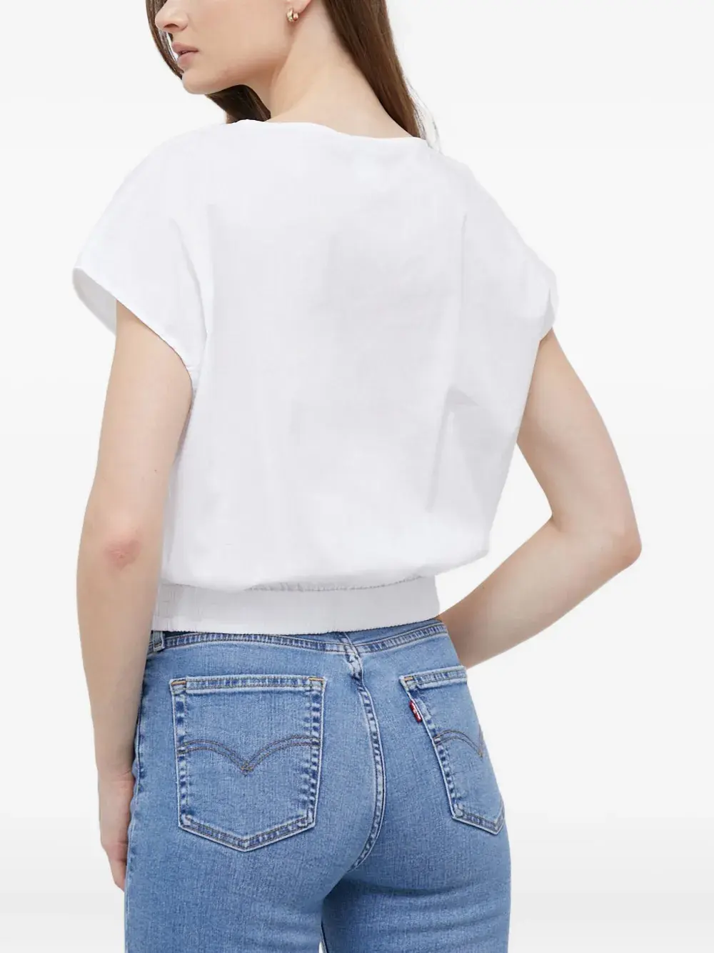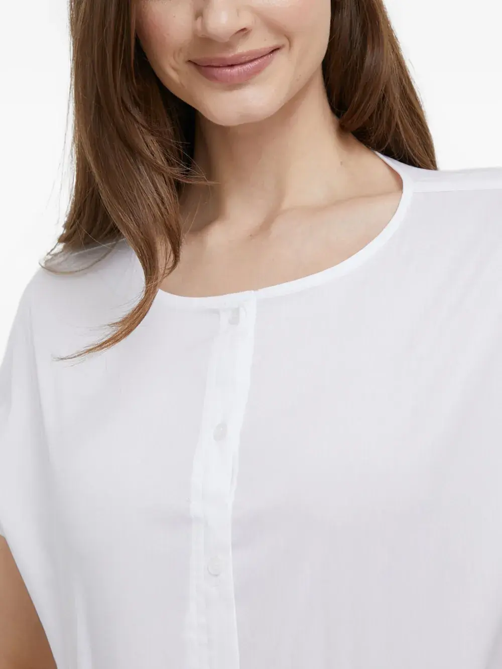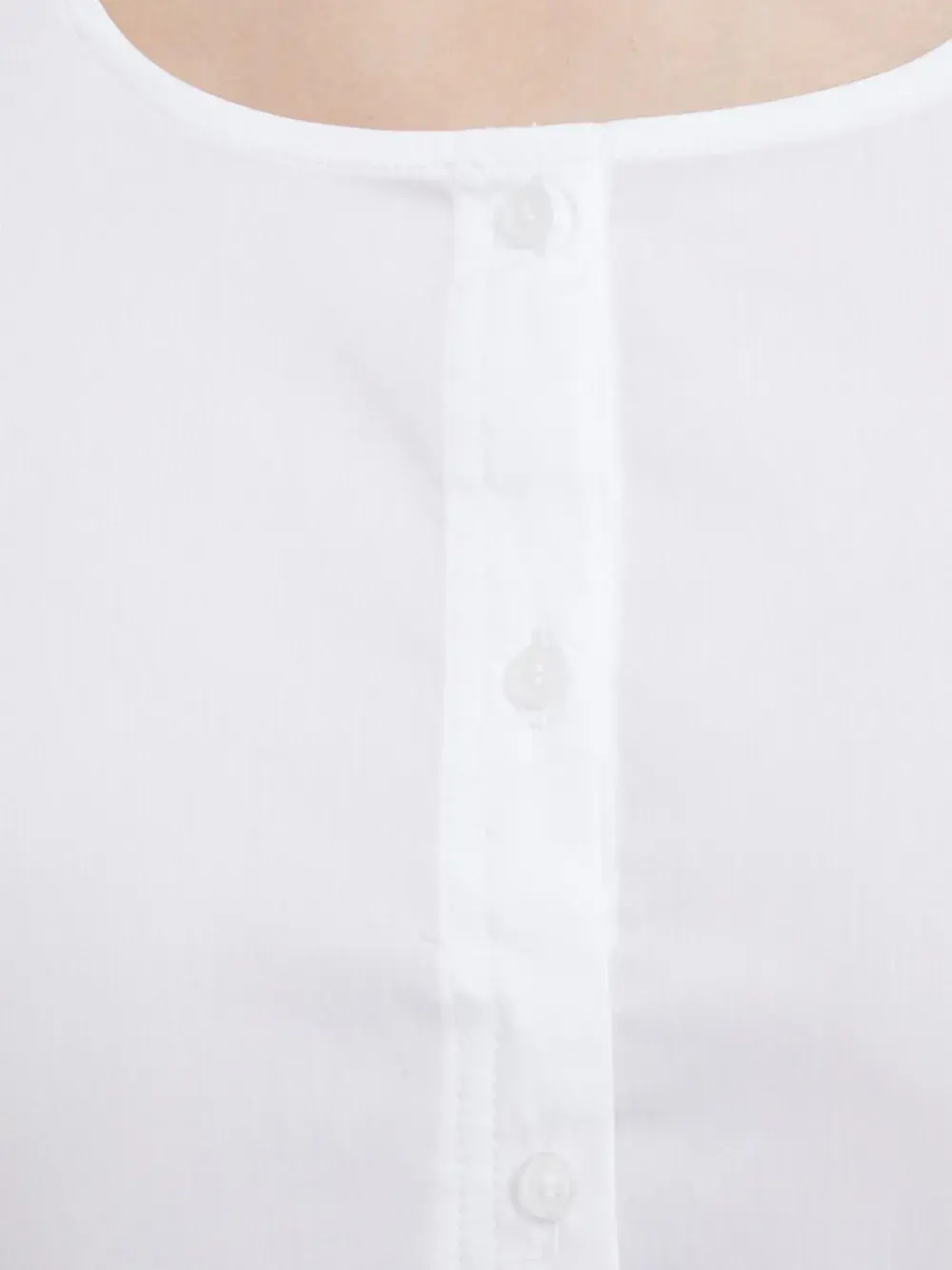 Белый топ с застежкой на пуговицы, короткими рукавами, круглым вырезом и эластичным подолом
