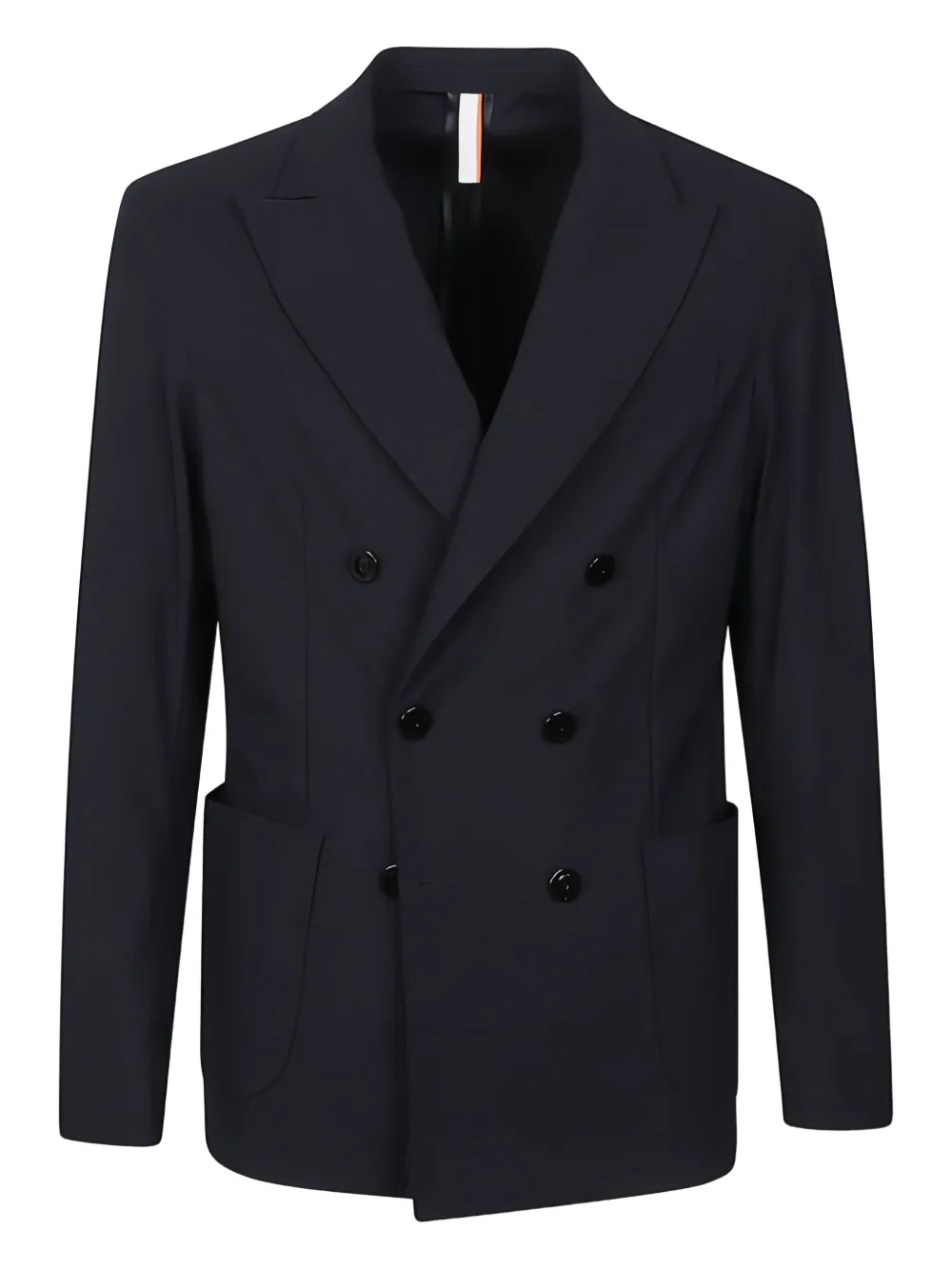 Синий двубортный пиджак с застежкой на пуговицы, лацканы с вырезом, накладные карманы спереди, длинные рукава