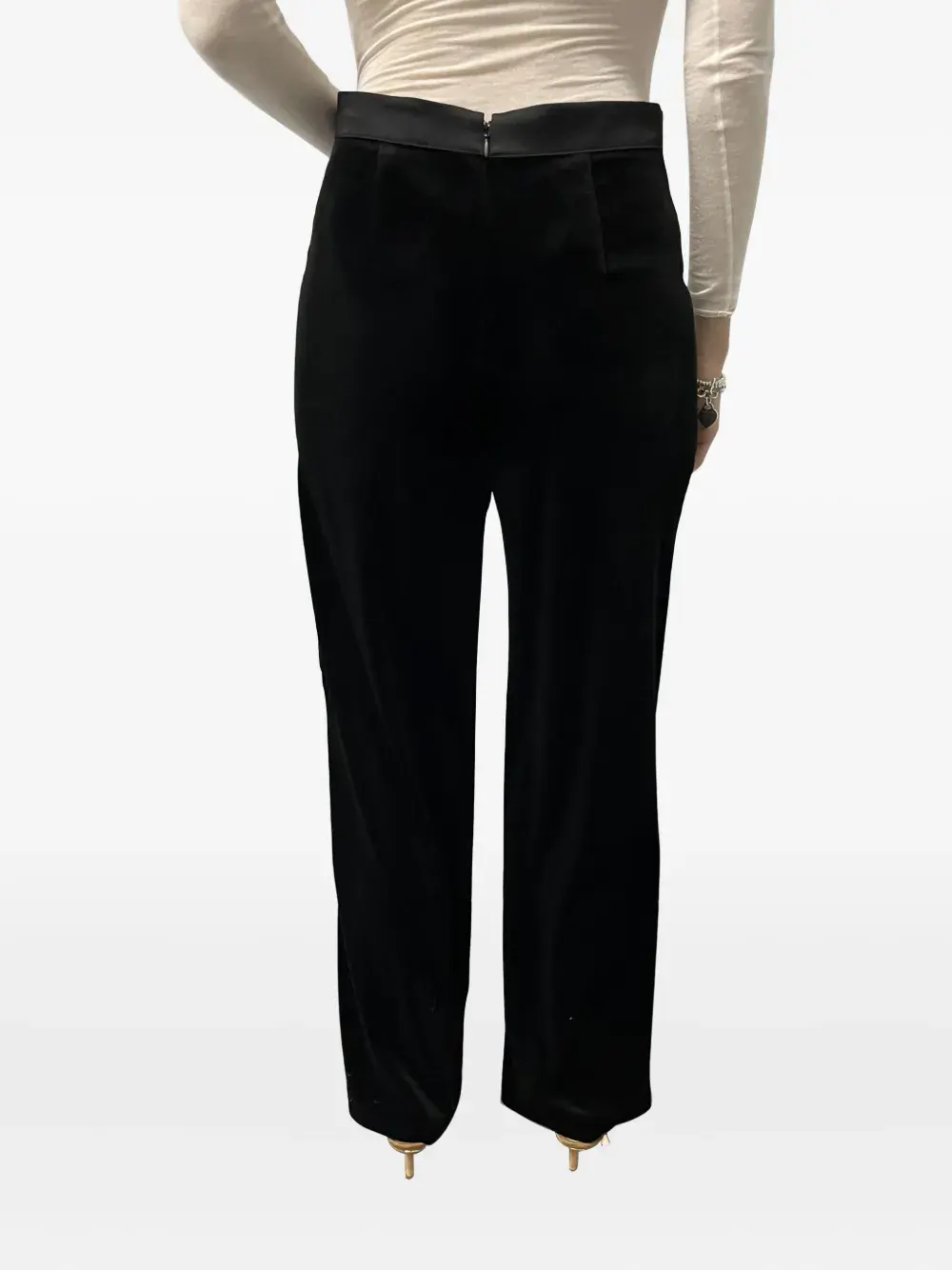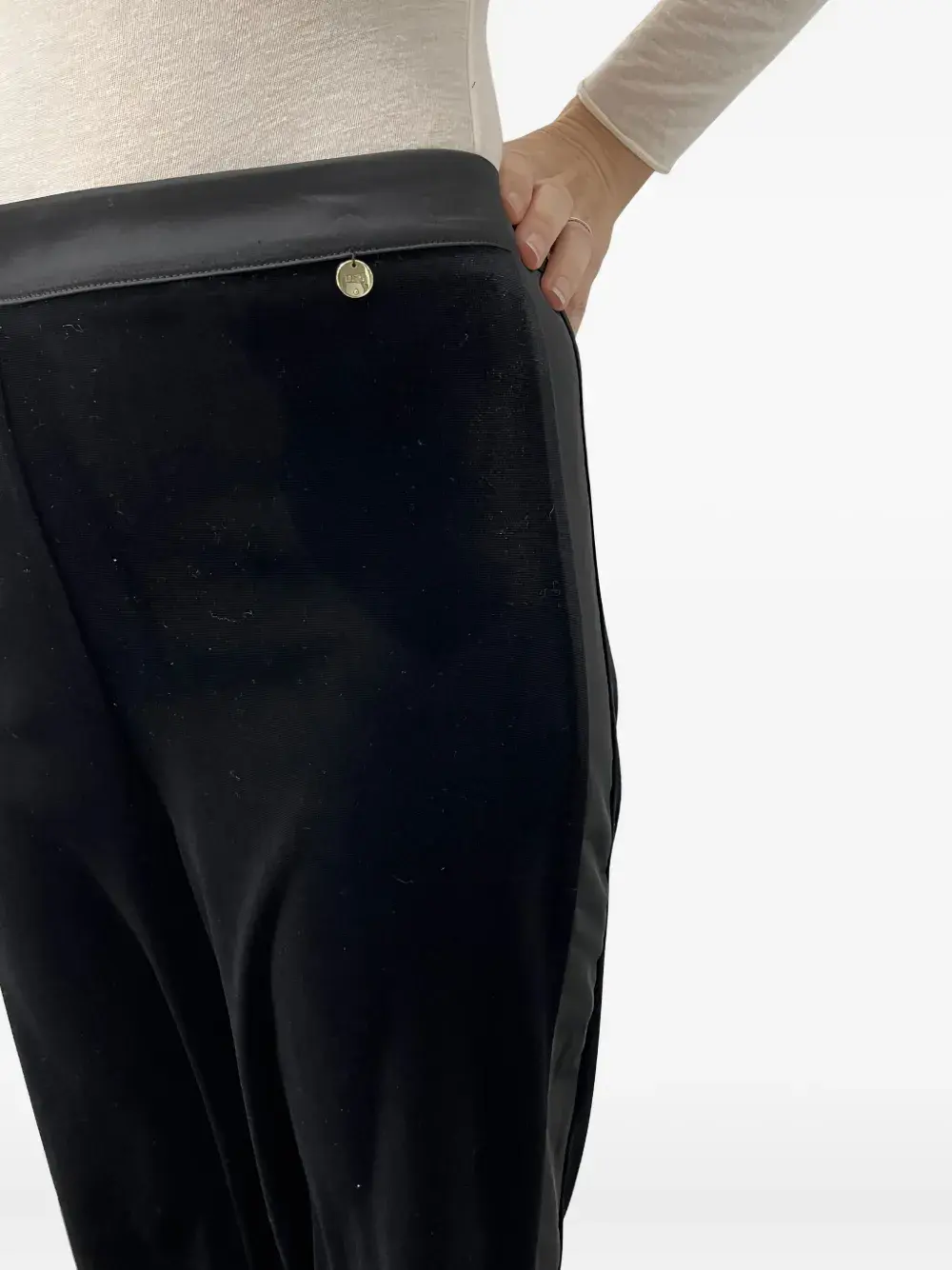 Черная трикотажная фактура, боковые полосы, тональная прострочка, фурнитура золотистого оттенка, эластичный пояс