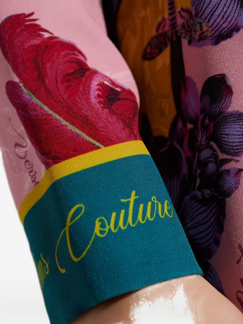 Светло-розовый и разноцветный принт по всей поверхности, длинные рукава, круглый вырез, застежка-молния сзади, принт с текстом