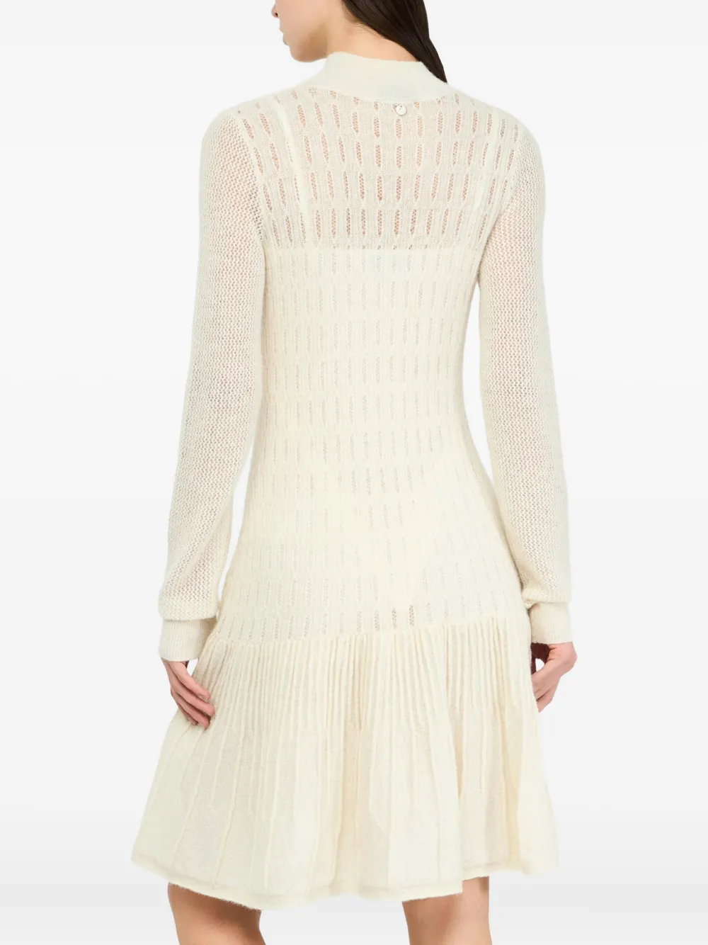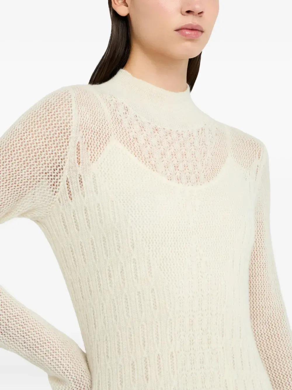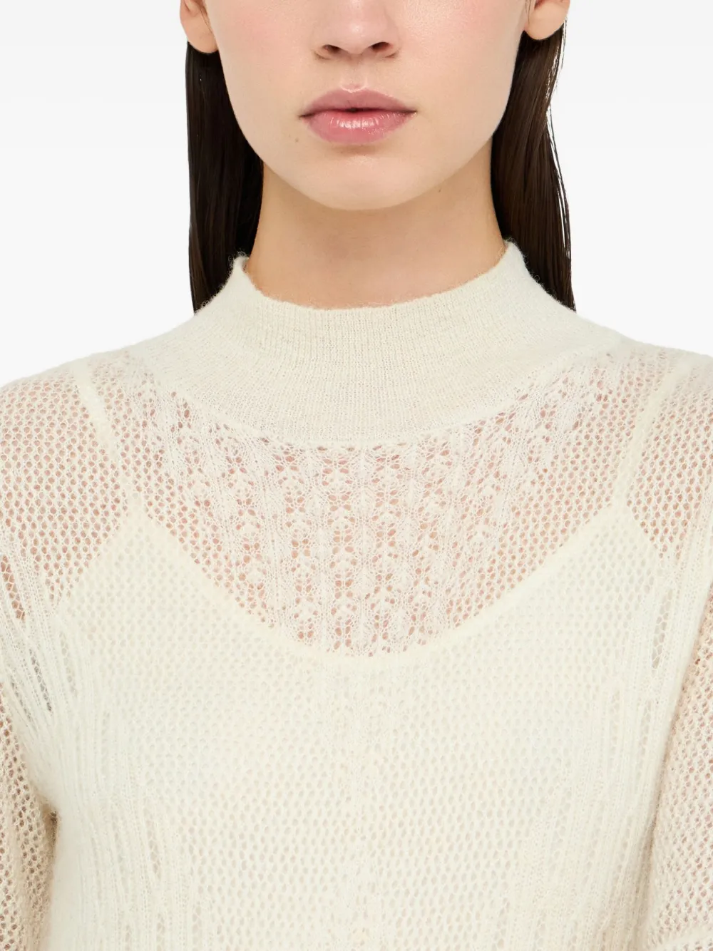 Белый свитер из шерстяной смеси с ажурной вязкой, высоким воротом, длинными рукавами, оборчатым подолом, металлическим логотипом на спине