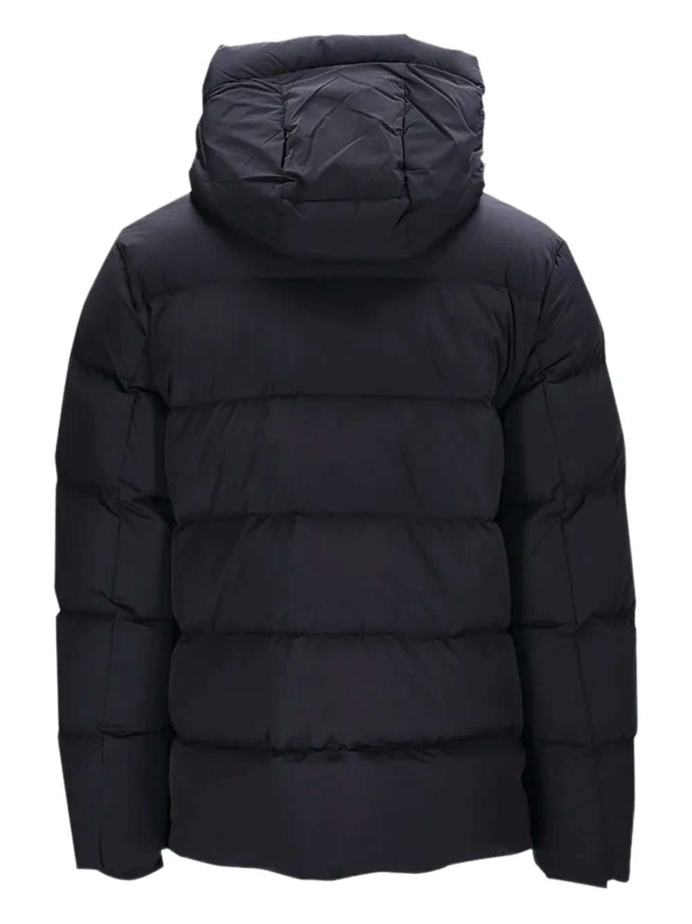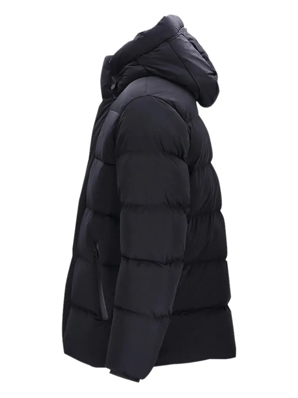 Черная пуховая куртка с капюшоном, застежка-молния, передние карманы на молнии, однотонный дизайн