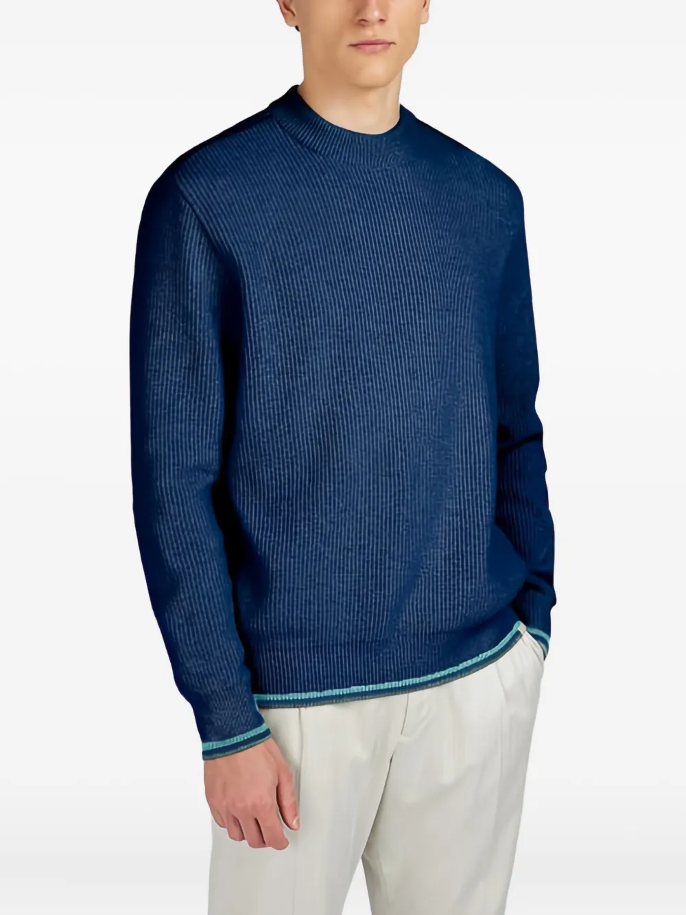 Синий в рубчик трикотажный свитер с круглым вырезом и длинными рукавами