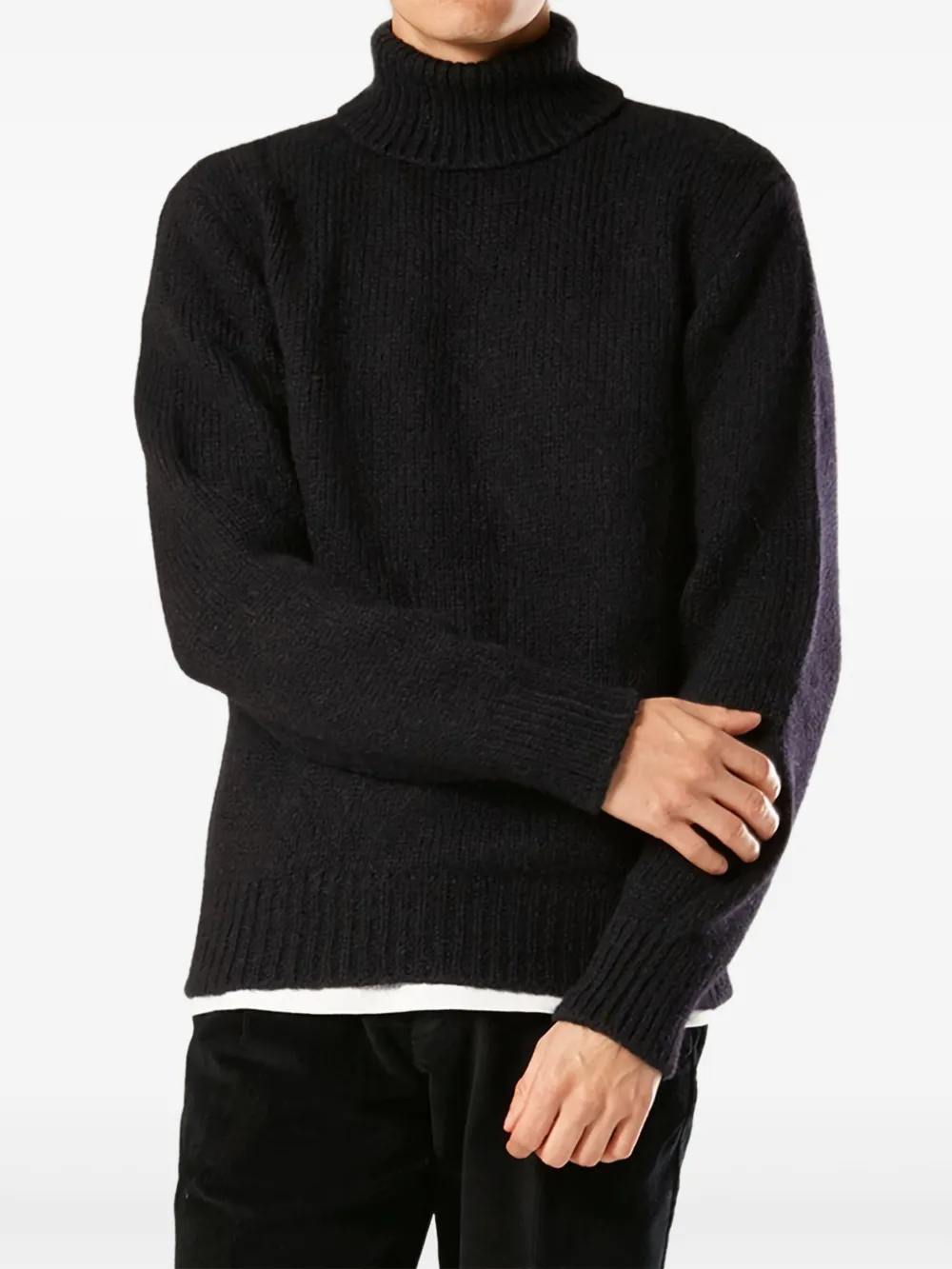 Синий свитер с высоким воротником, рубчатой вязкой, длинными рукавами и прямым подолом