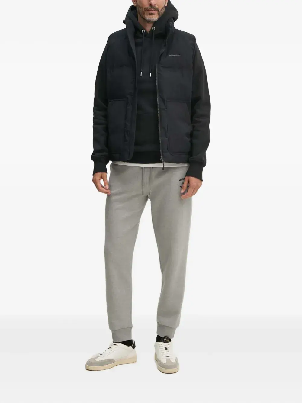 Серый цвет, шнурок для завязывания, эластичный пояс, боковые карманы, задний карман, эластичные манжеты