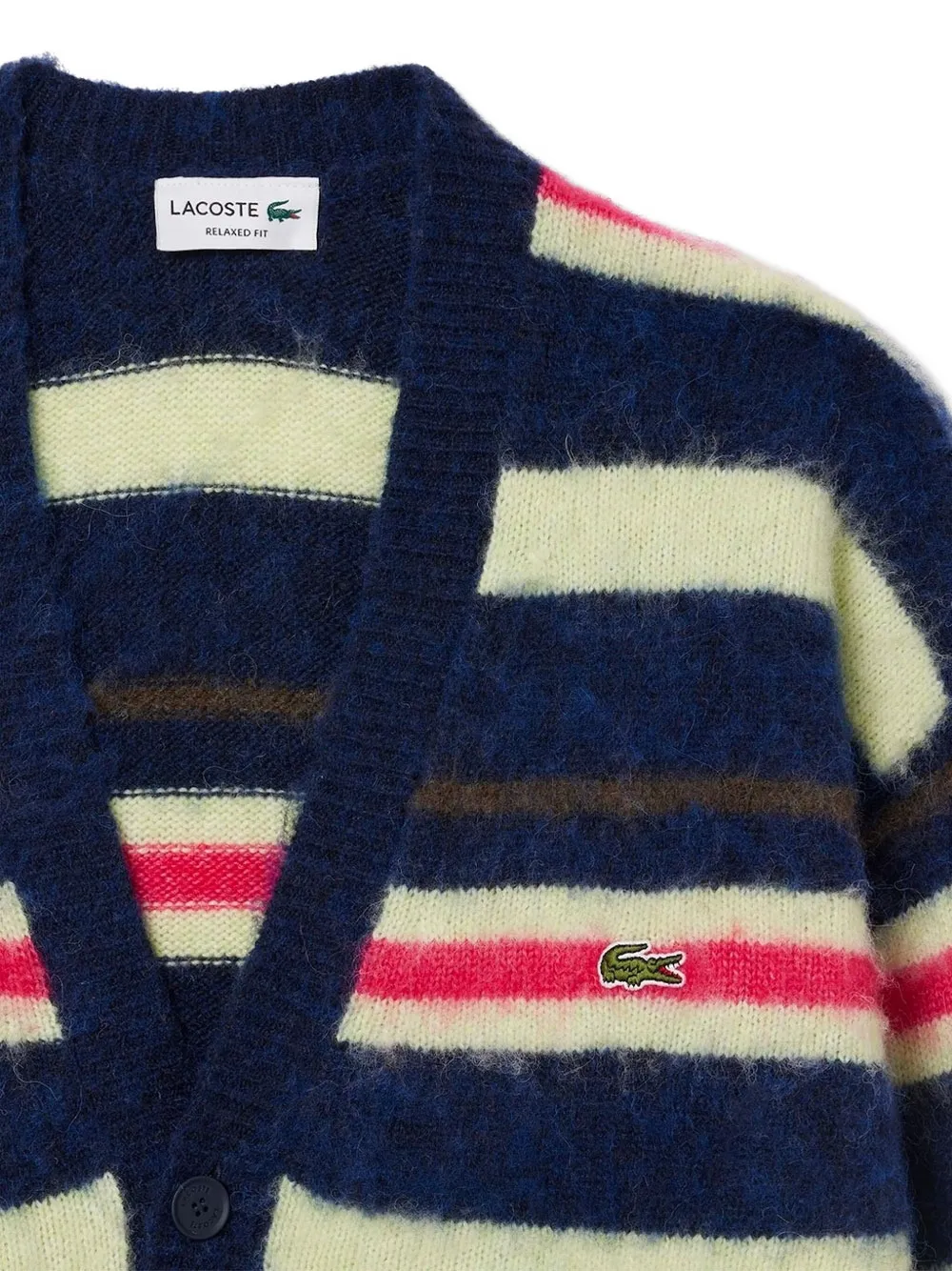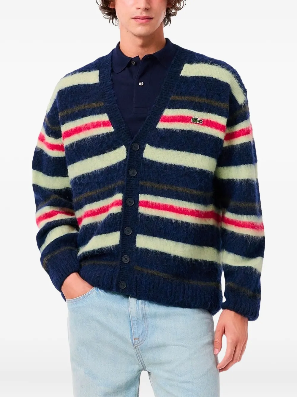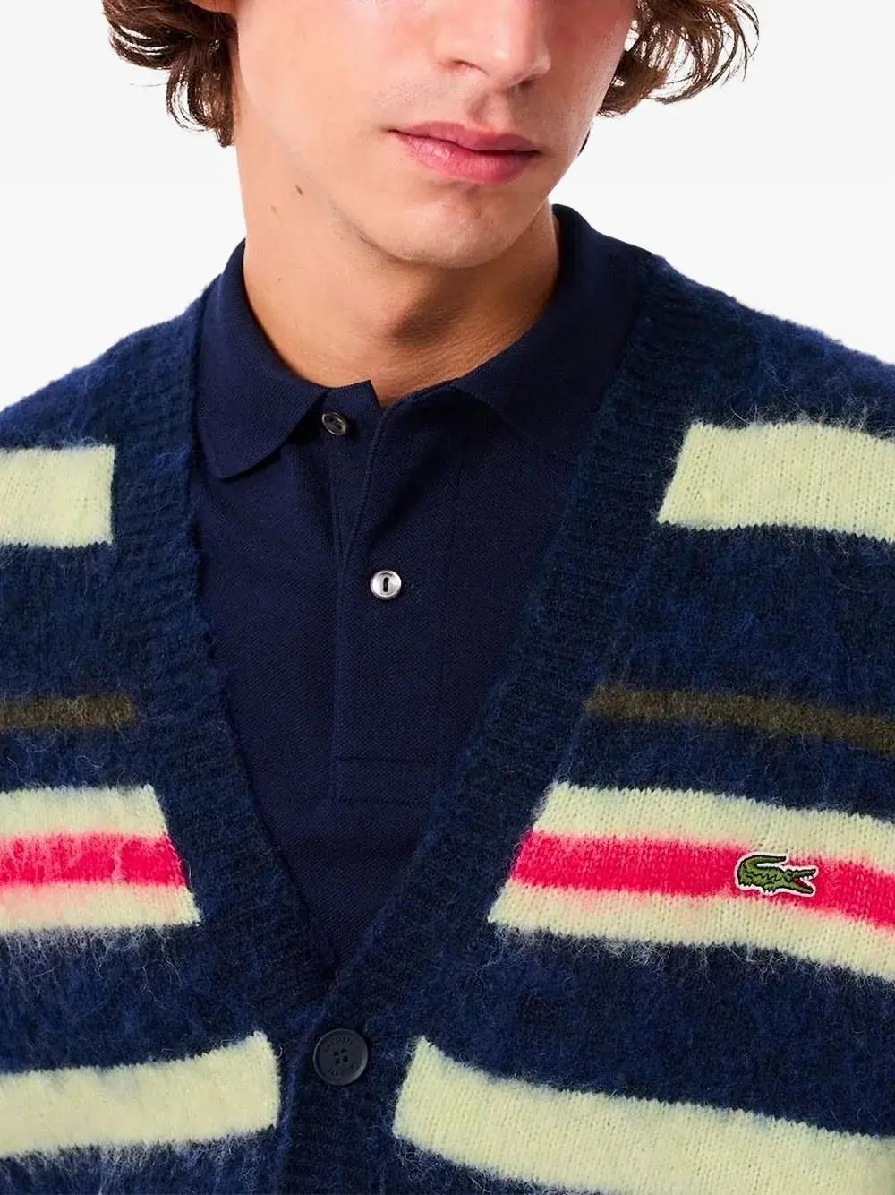 Темно-синий полосатый узор, застежка на пуговицы, нашивка с логотипом, V-образный вырез, длинные рукава