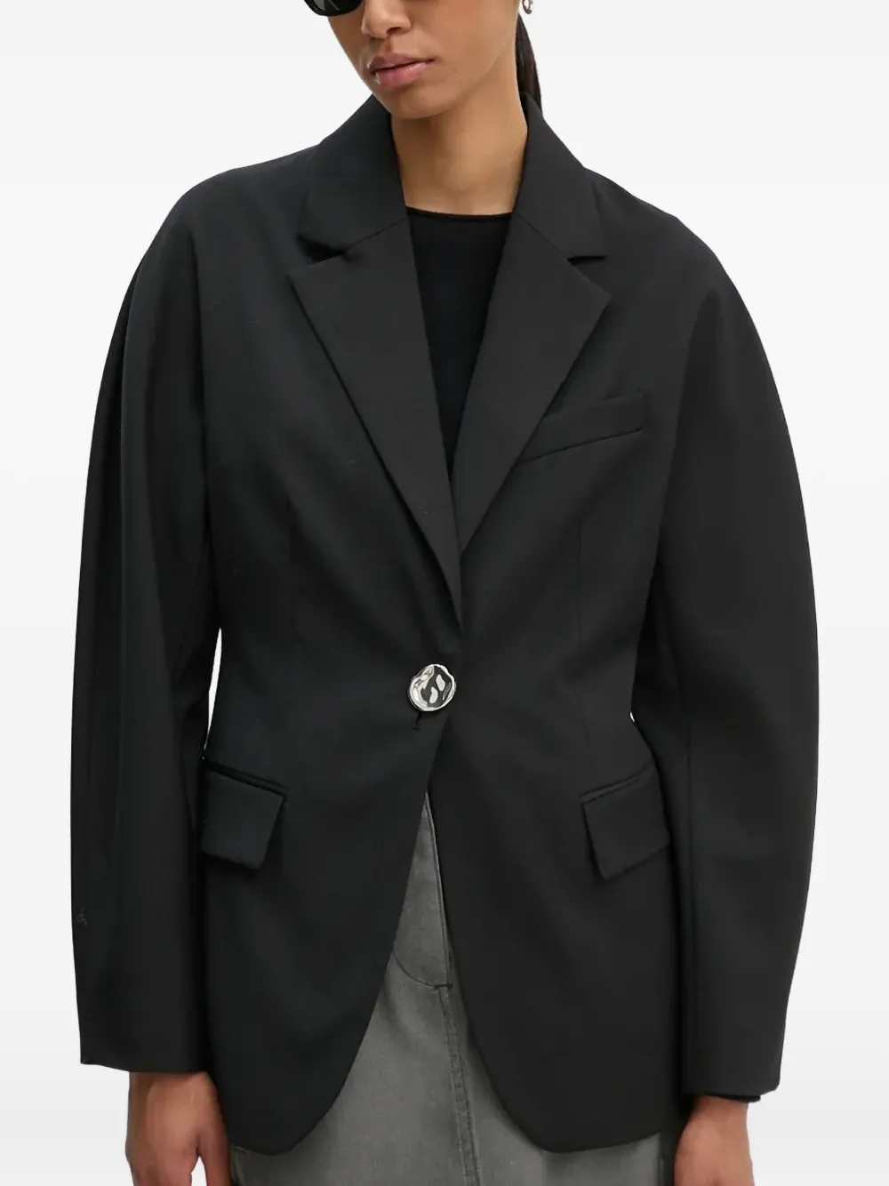 Черный однобортный пиджак с заостренными лацканами, застежкой на пуговицы спереди, передними клапанными карманами и длинными рукавами