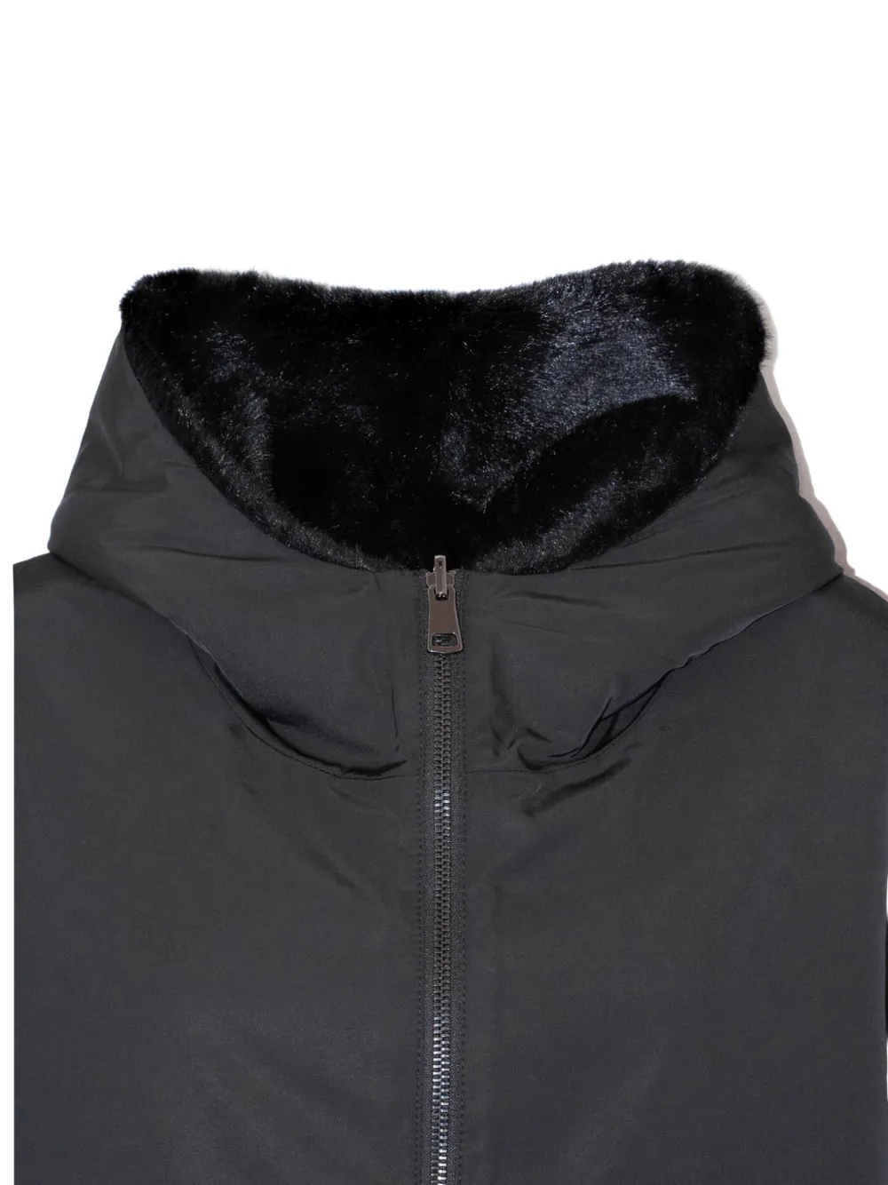 Черная двусторонняя искусственная шуба с капюшоном и застежкой-молнией