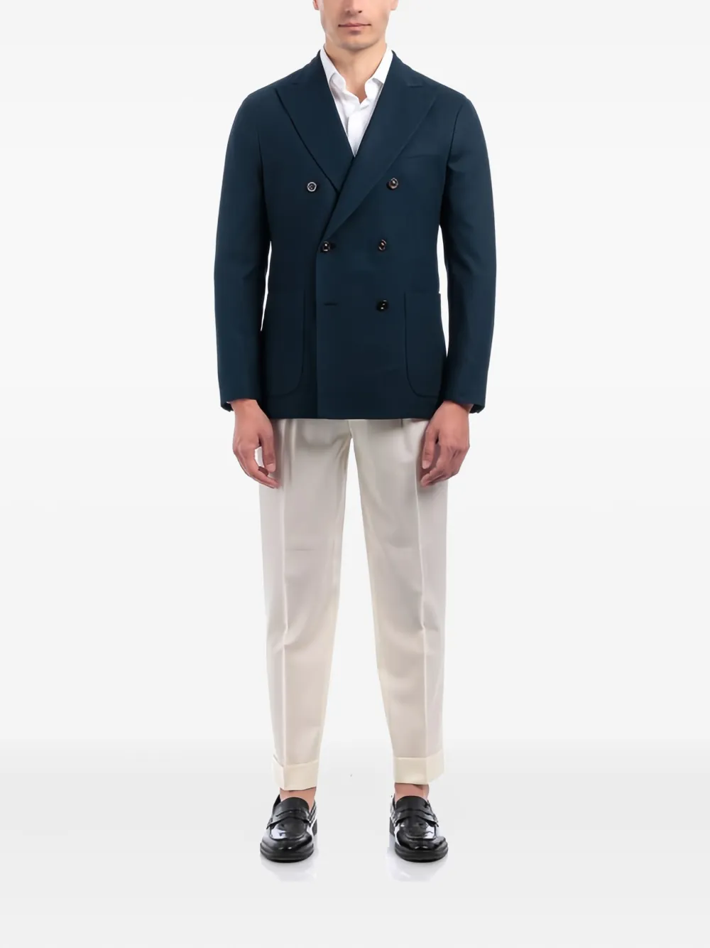 Синий двубортный пиджак, застежка на пуговицы, накладные карманы спереди, манжеты на пуговицах, лацканы с острыми концами