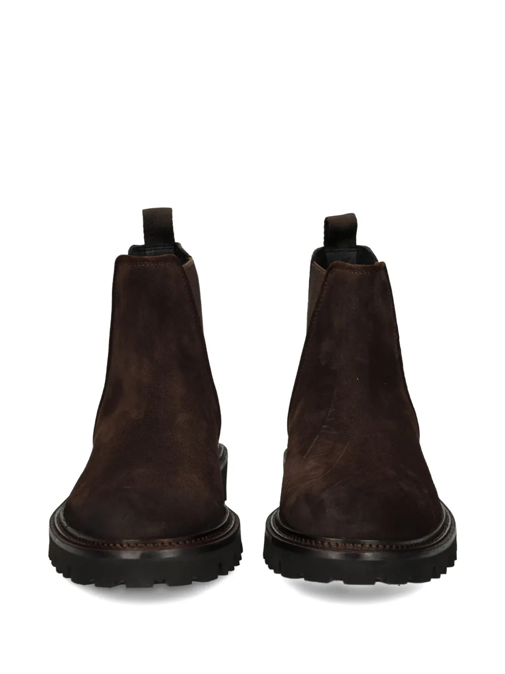 Темно-коричневые замшевые слипоны, петля на задней части, эластичные боковые вставки, круглый носок, рифленая резиновая подошва