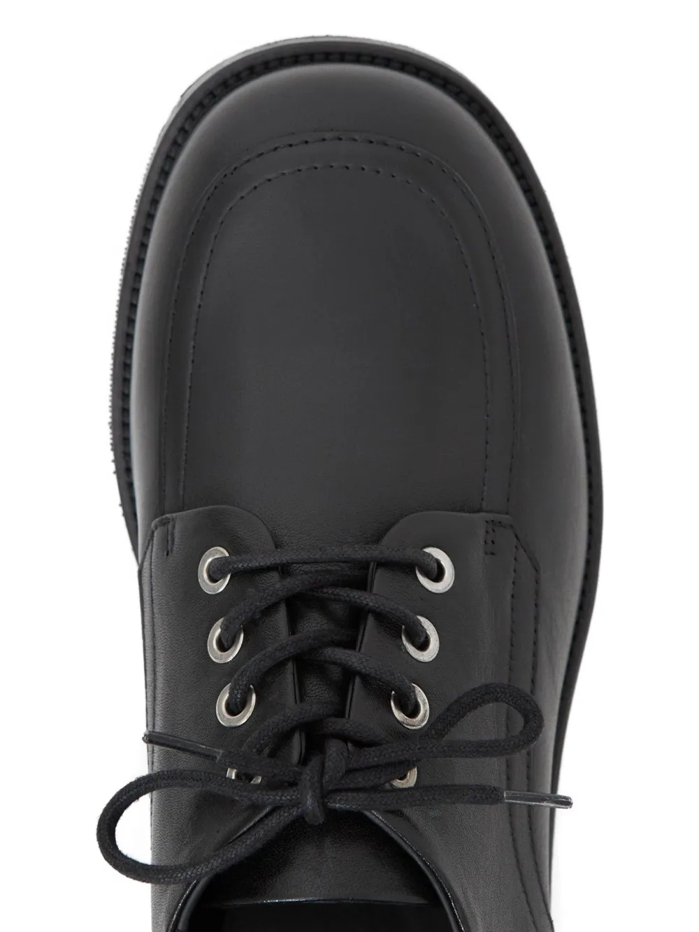 Черная телячья кожа, шнуровка, металлические люверсы, отстрочка, широкий каблук