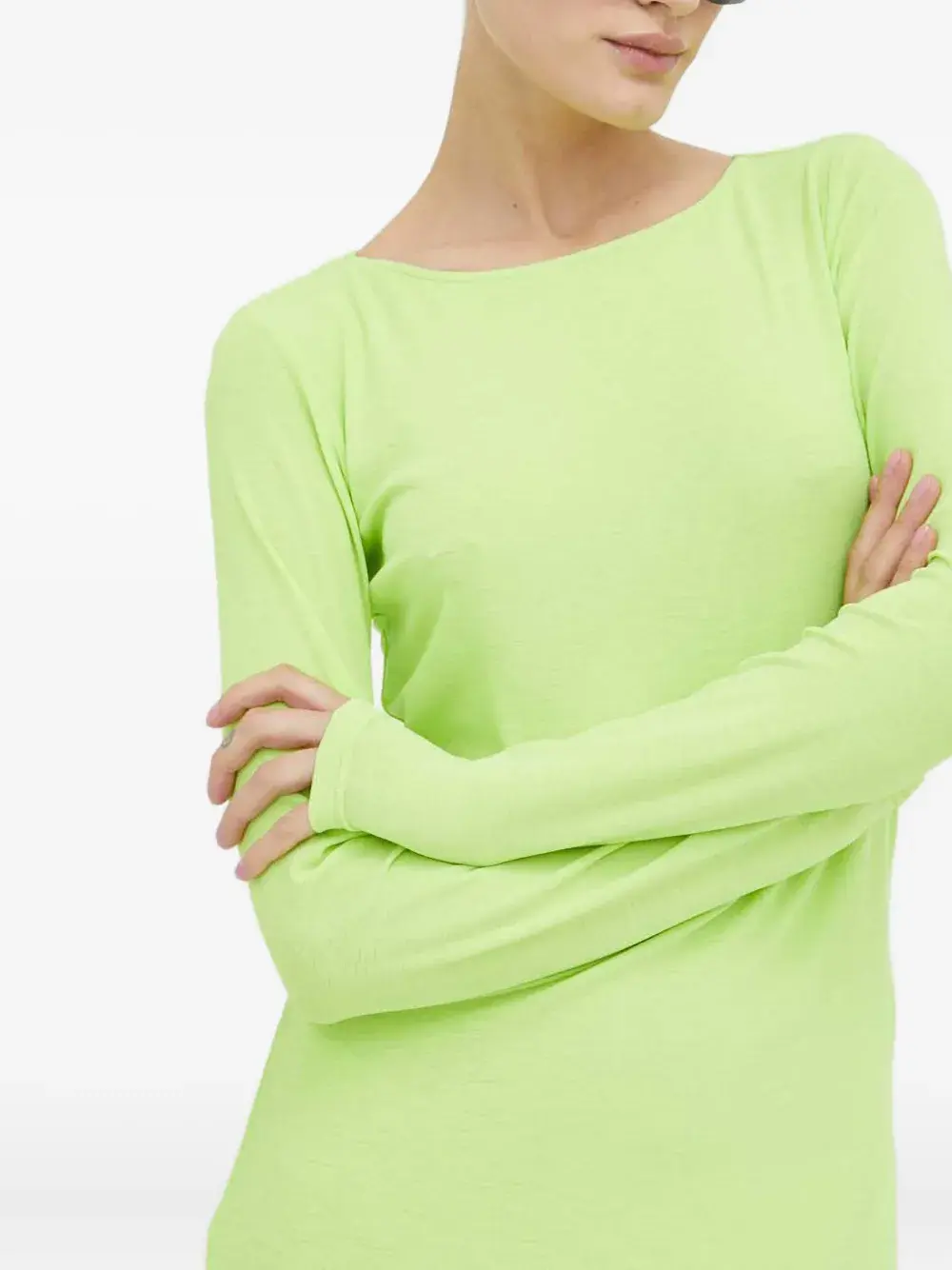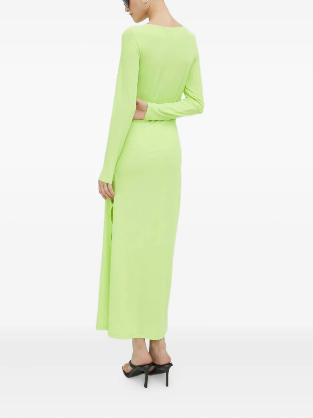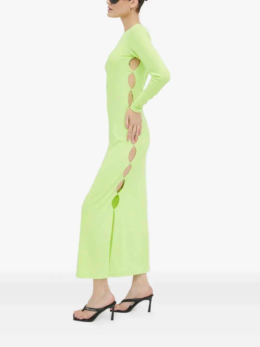Зеленое платье с вырезами по бокам, длинными рукавами, круглым вырезом и разрезом сбоку