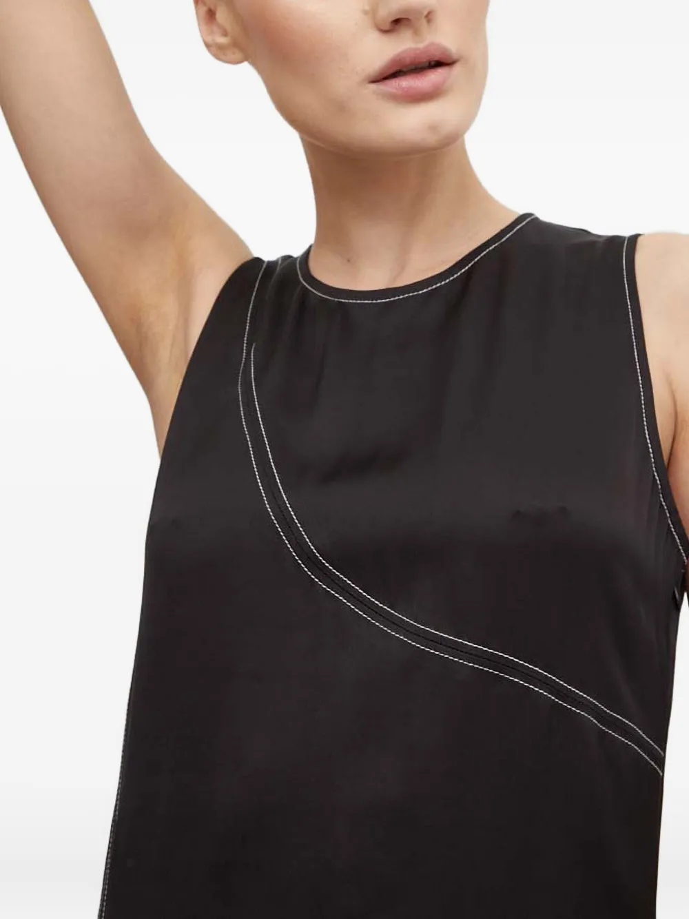 Черное платье с контрастной прострочкой, круглым вырезом, без рукавов, застежкой-молнией сзади, средней длины