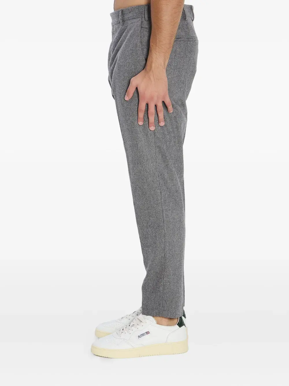 Серые шлевки для ремня, застежка на пуговицу, два боковых кармана, два задних кармана