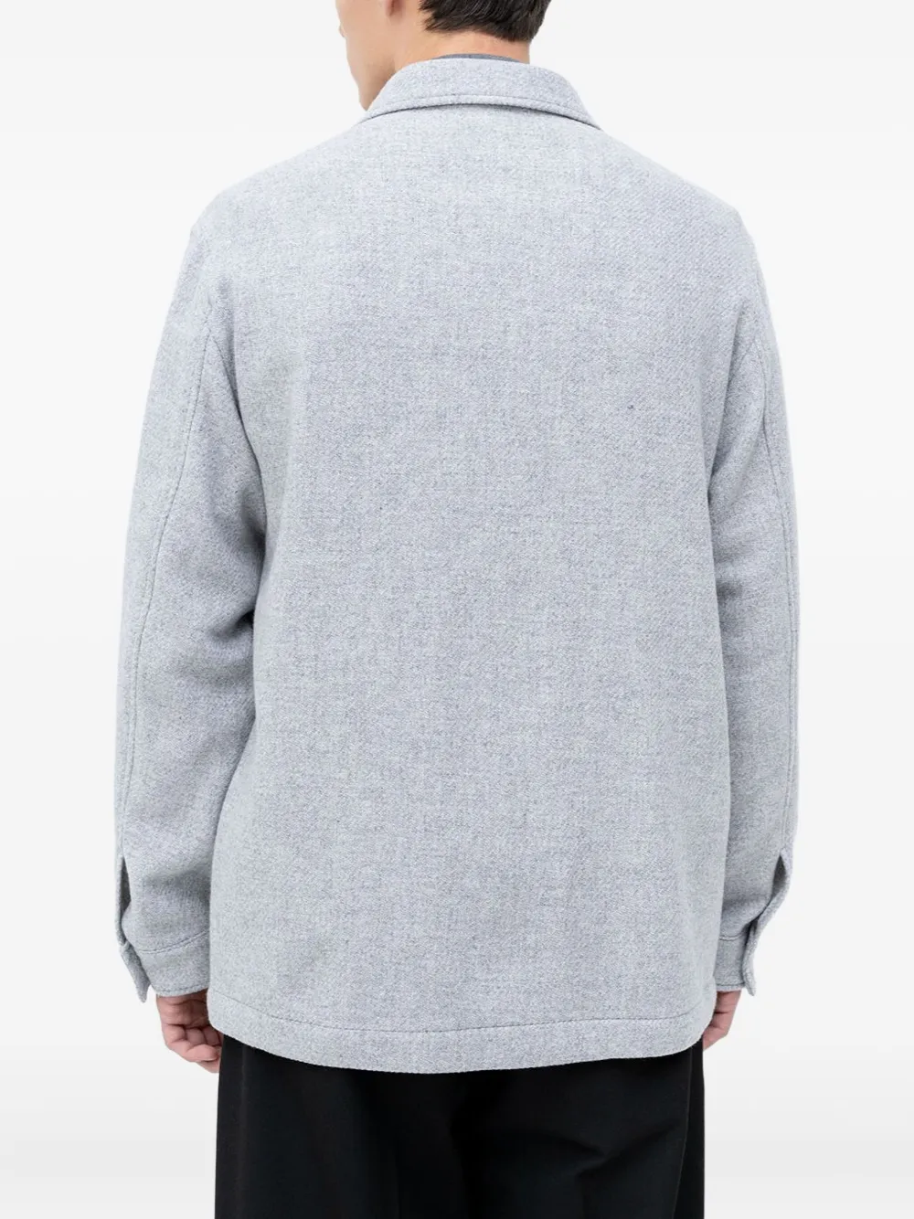 Светло-серая рубашка с застежкой на пуговицы, отложным воротником, длинными рукавами, накладными карманами и манжетами на пуговицах