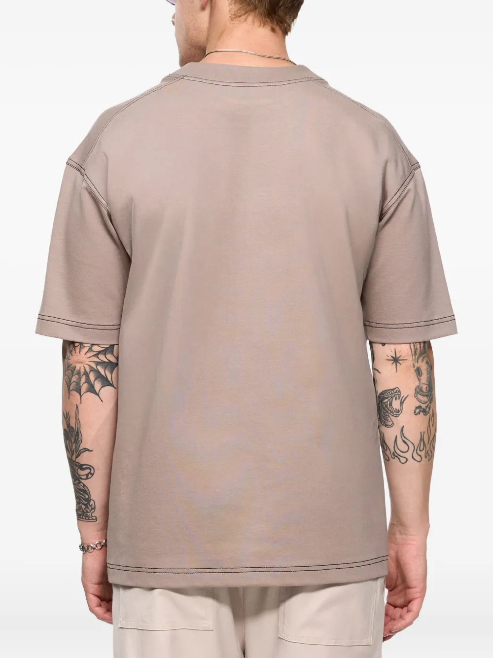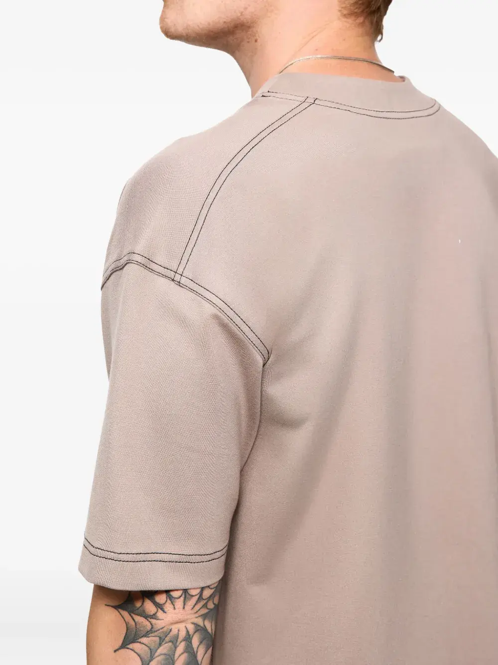 Бежевый топ с отделкой строчкой, короткими рукавами, круглым вырезом и прямым подолом