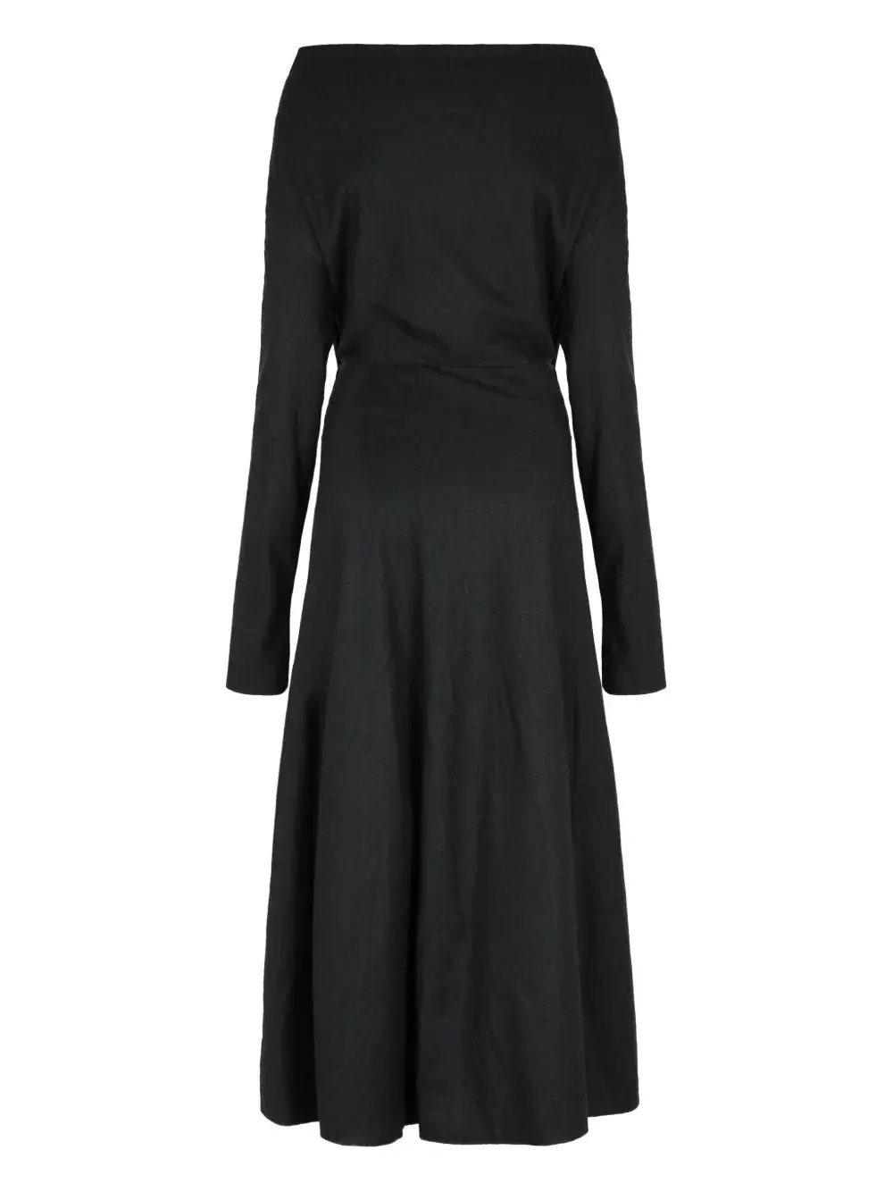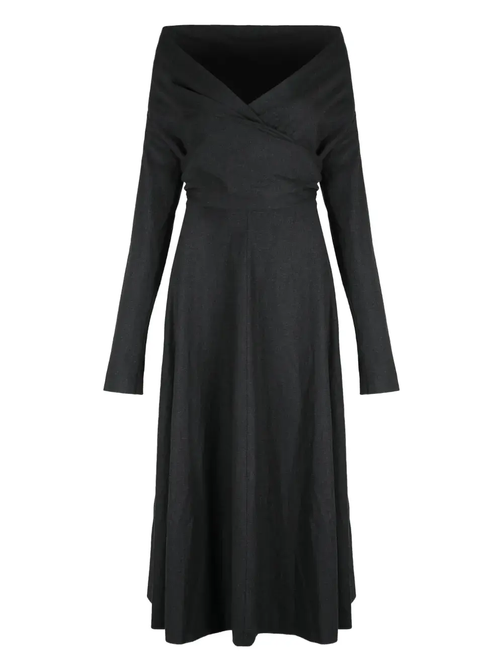 Темно-серое платье с драпировкой, длинными рукавами, открытыми плечами, запахом и длиной ниже колена