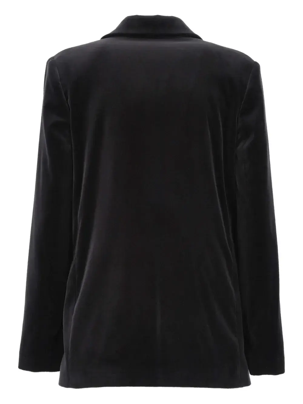 Темно-серый двубортный пиджак с лацканами, застежкой на пуговицы, длинными рукавами и прорезными карманами