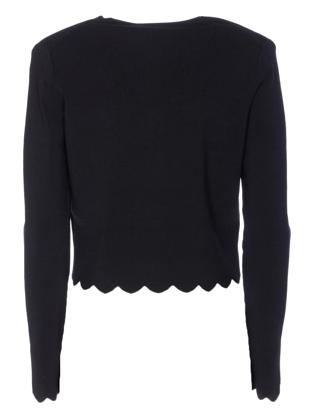 Черная кофта с застежкой на пуговицы спереди, круглым вырезом, длинными рукавами, усиленными плечами и волнистым краем