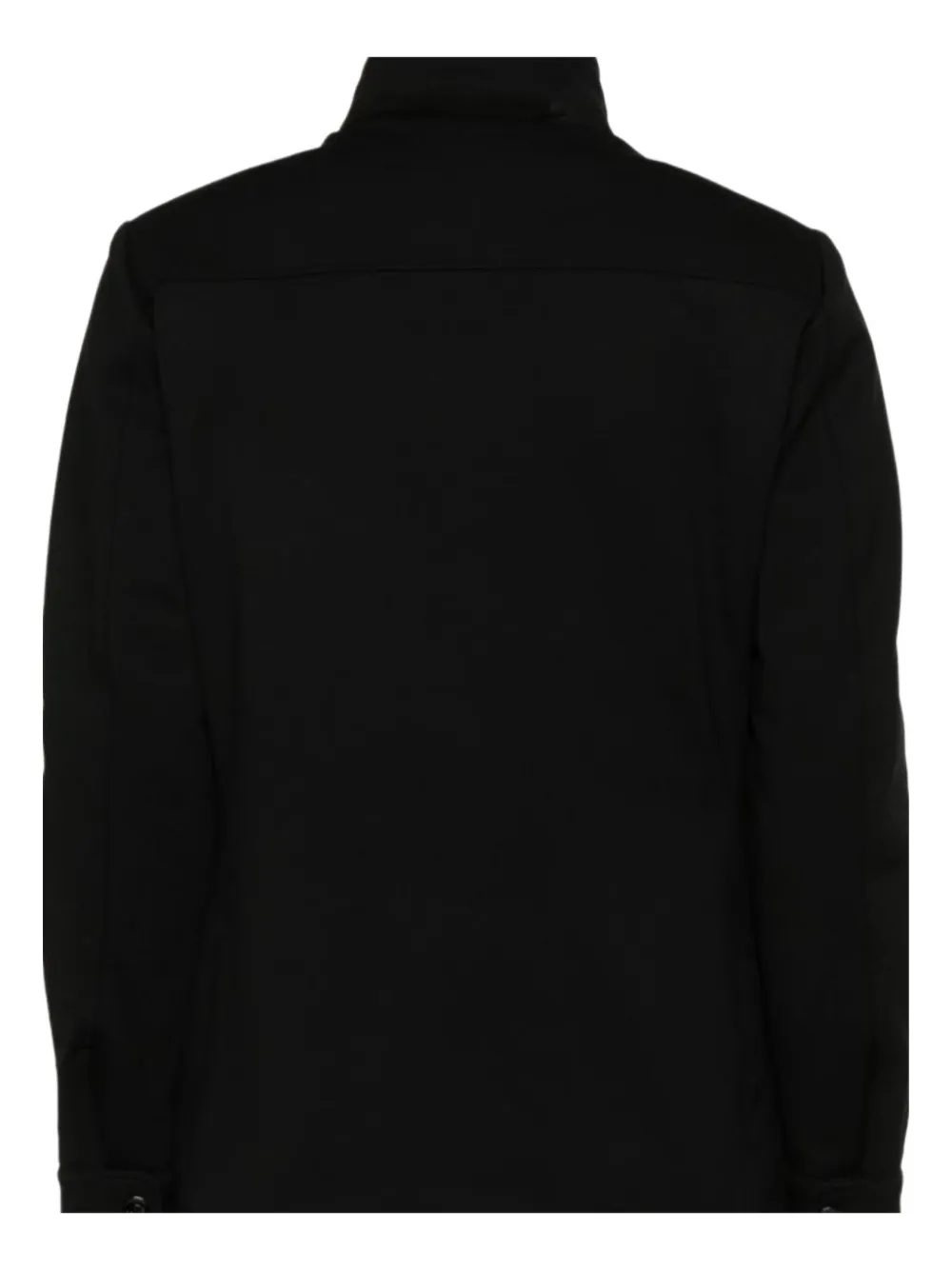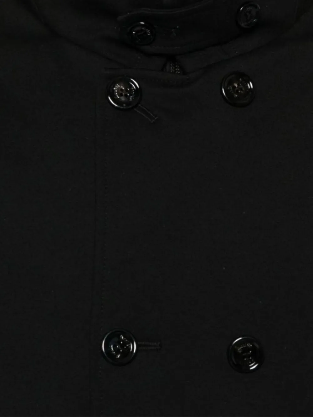 Черный двубортный пиджак с застежкой на пуговицы спереди, высоким воротником, двумя передними клапанными карманами, длинными рукавами
