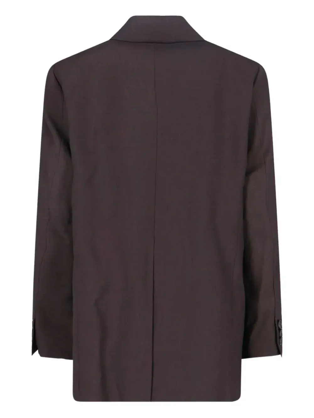 Коричневый цвет, лацканы с вырезом, застежка на пуговицы спереди, длинные рукава, манжеты на пуговицах, два передних прорезных кармана с клапанами