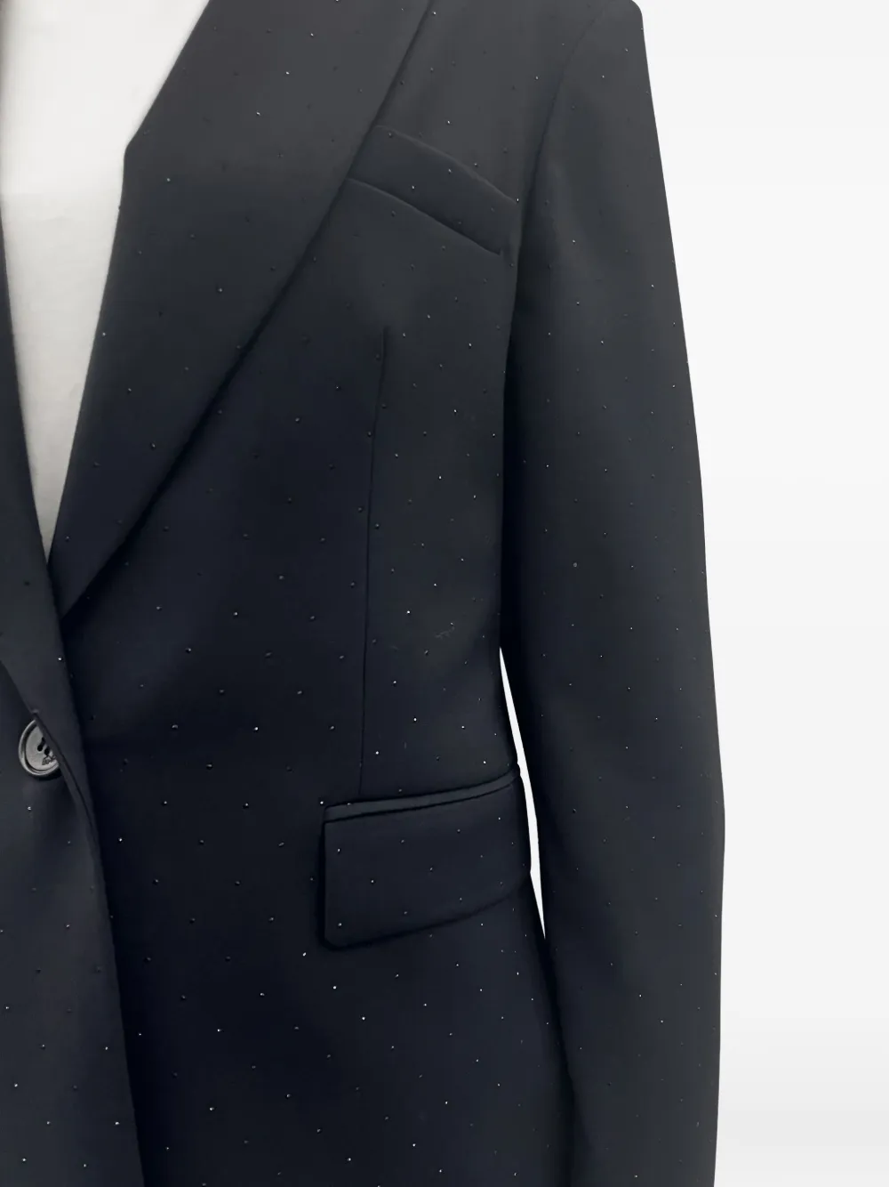 Черные лацканы с украшением из страз, однобортная застежка на пуговицу, клапанные карманы