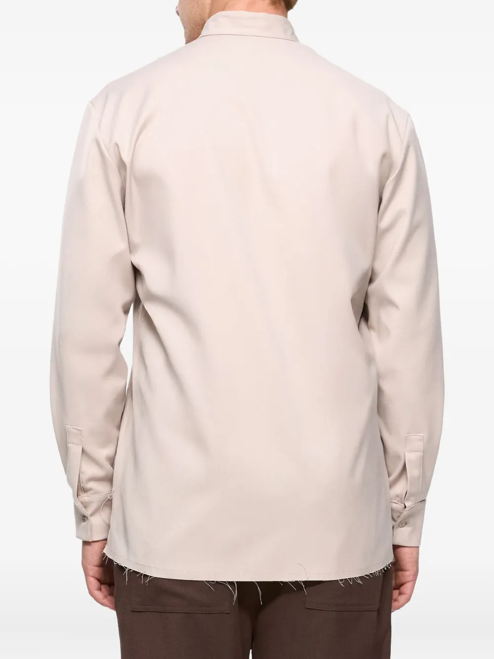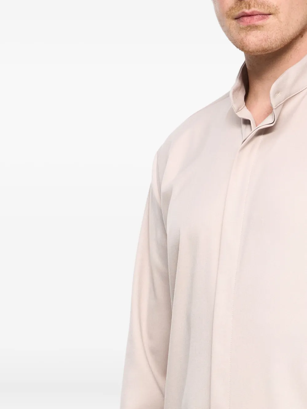 Ванильного цвета рубашка с воротником-стойкой, застежкой на пуговицы, длинными рукавами, манжетами на пуговицах и прямым подолом