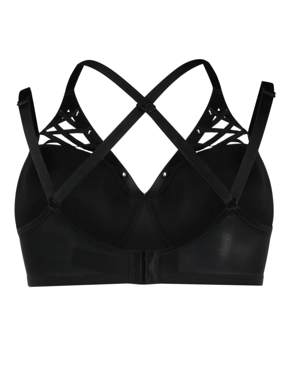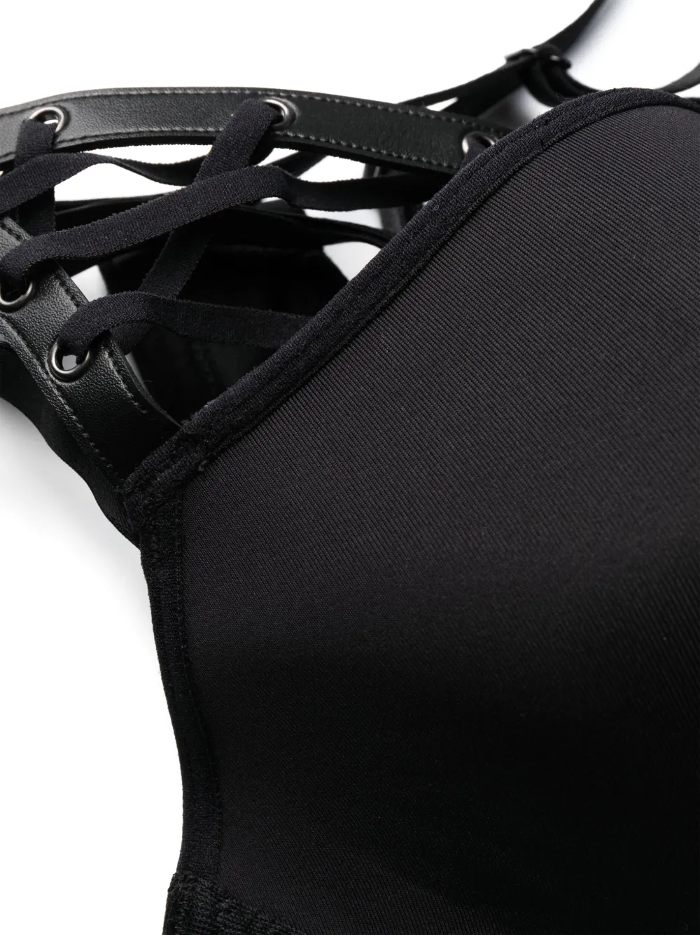 Подробнее о товаре: Черный, смесовый переработанный нейлон, модель планж, балконет, дутый материал, декоративная шнуровка, люверсы, перекрестные бретели на спине, регулируемые тонкие бретели и застежка на крючок сзади. Этот товар как минимум на 50% состоит из переработанных или повторно использованных материалов. Узнать больше о том, какие товары получают отметку «Ответственный выбор», можно из материала «Как мы оцениваем экологичность и этичность».