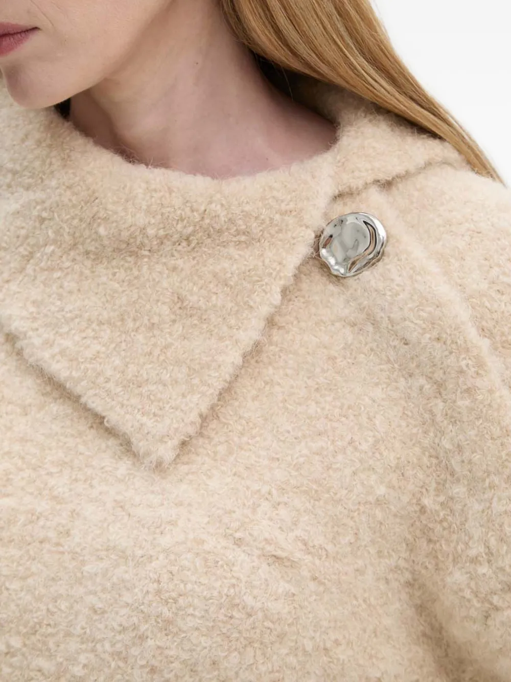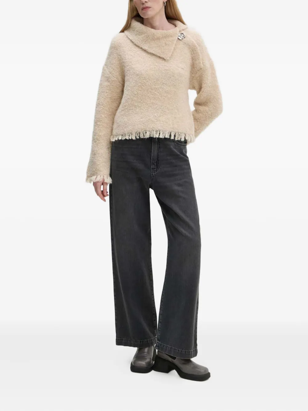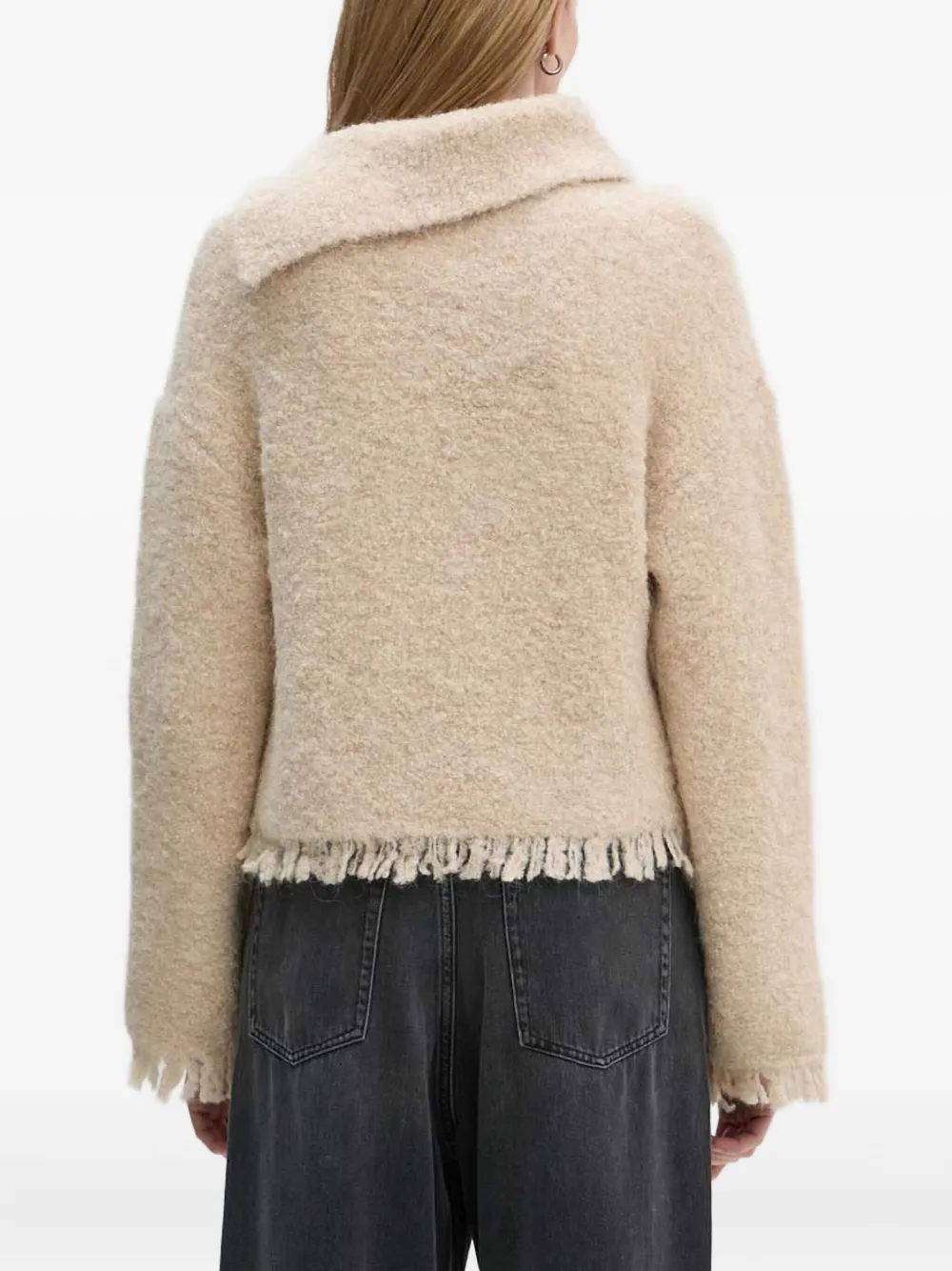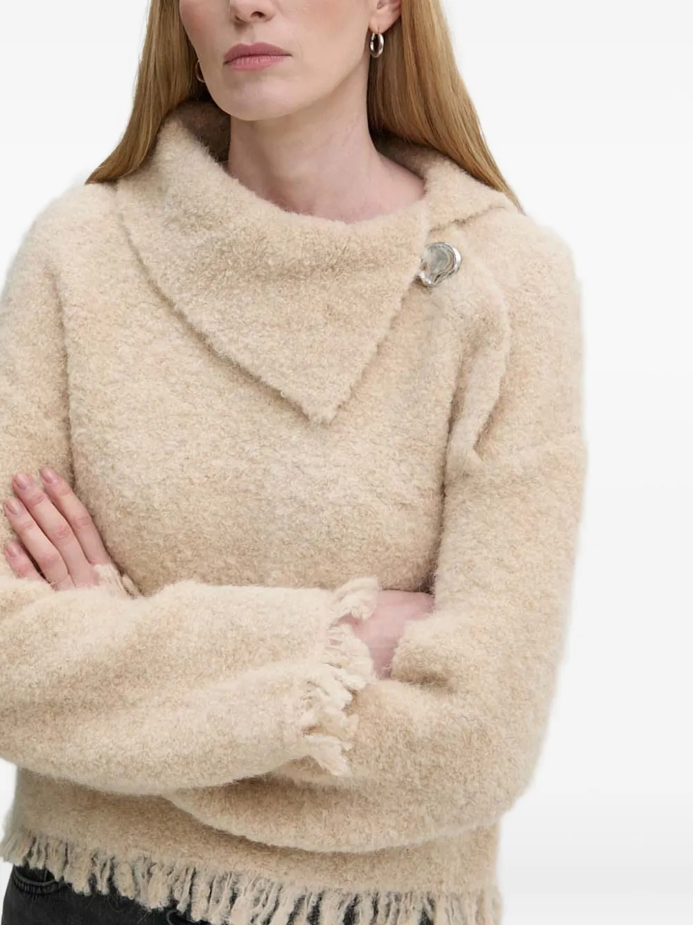 Бежевый с бахромой, асимметричный воротник, длинные рукава