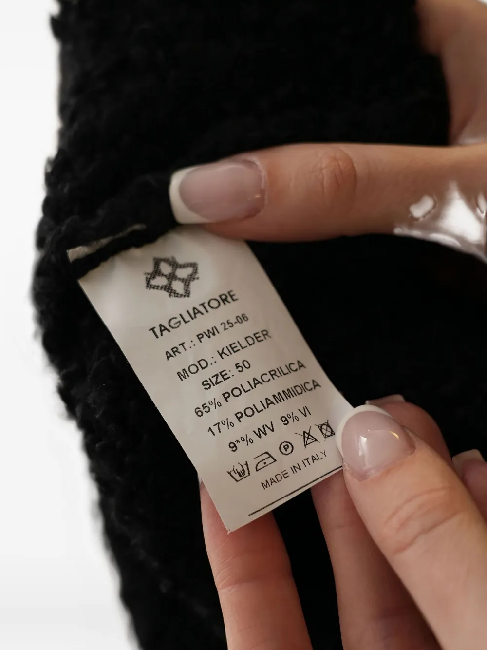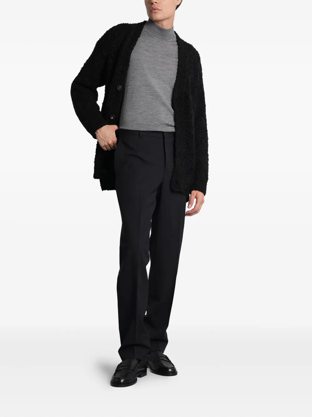 Черный фактурный трикотаж, застежка на пуговицы, V-образный вырез, длинные рукава