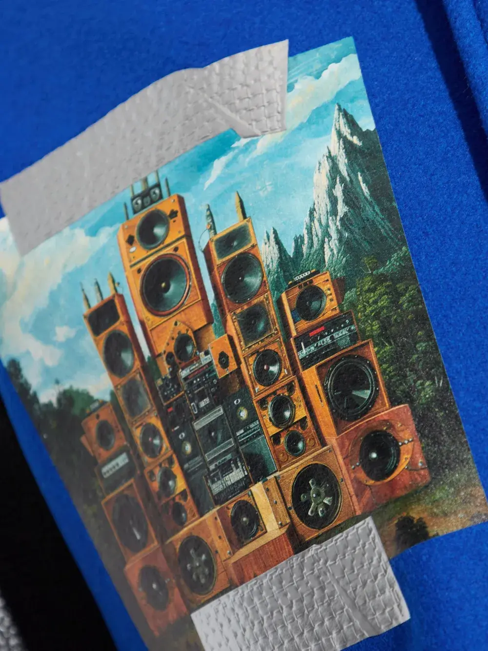 Синяя вышитая эмблема, ребристые отделка и манжеты, застежка на кнопки, длинные рукава, графичный принт