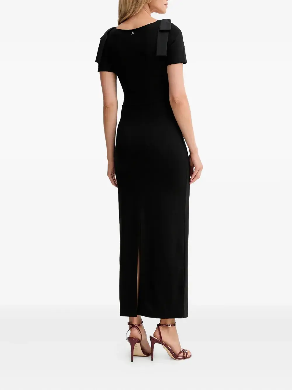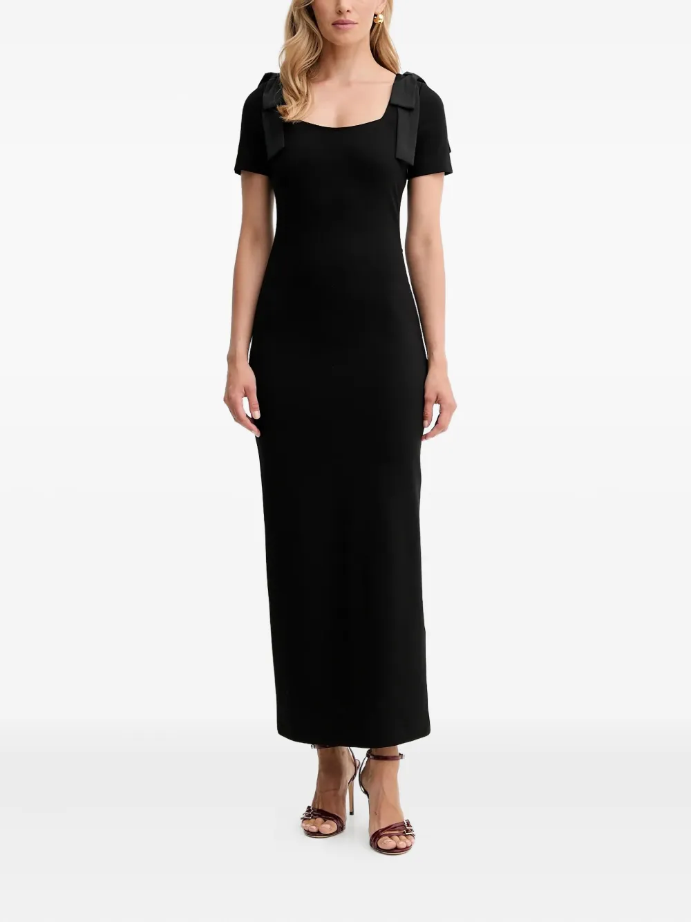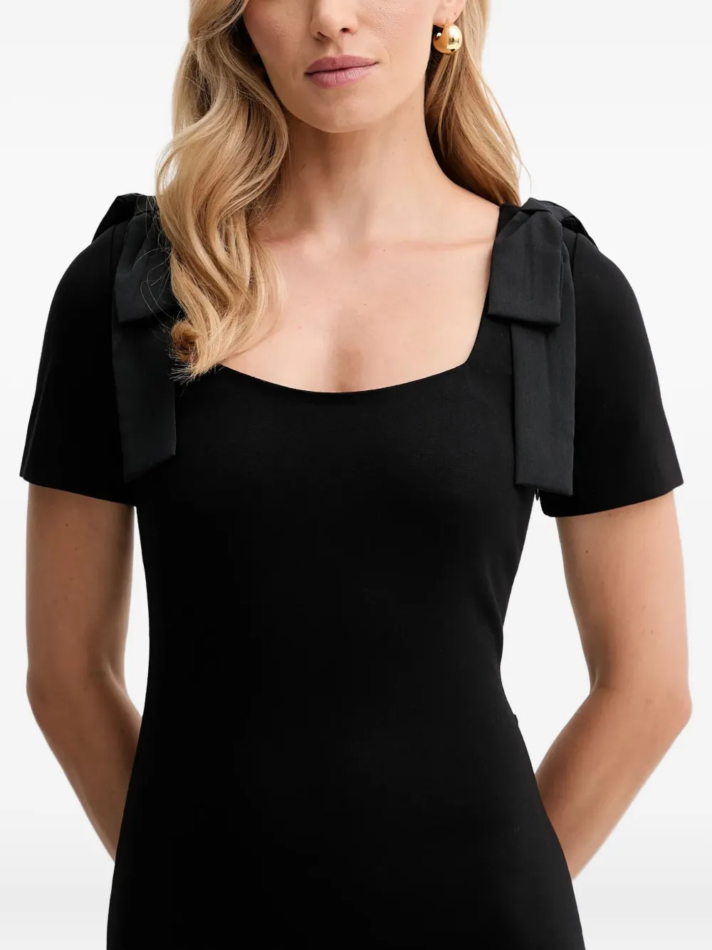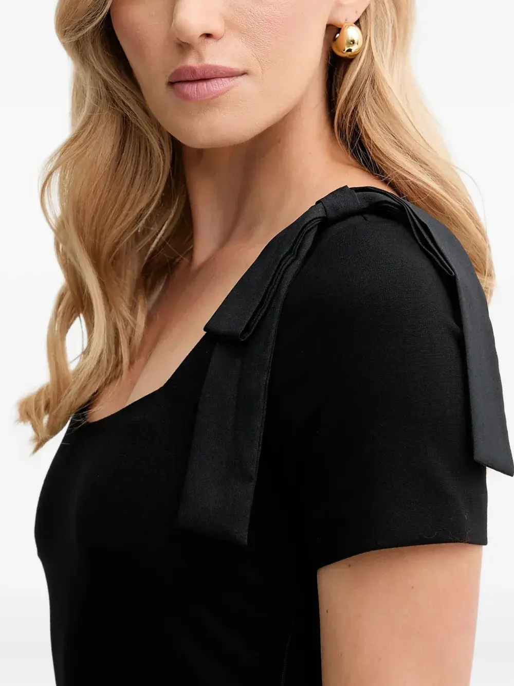 Черное платье с бантом, квадратным вырезом, короткими рукавами и разрезом сзади