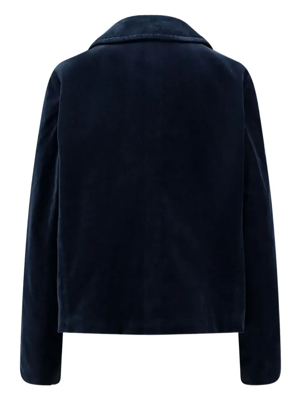 Темно-синяя, застежка на пуговицы, лацканы с вырезом, передние клапанные карманы, длинные рукава, прямой подол