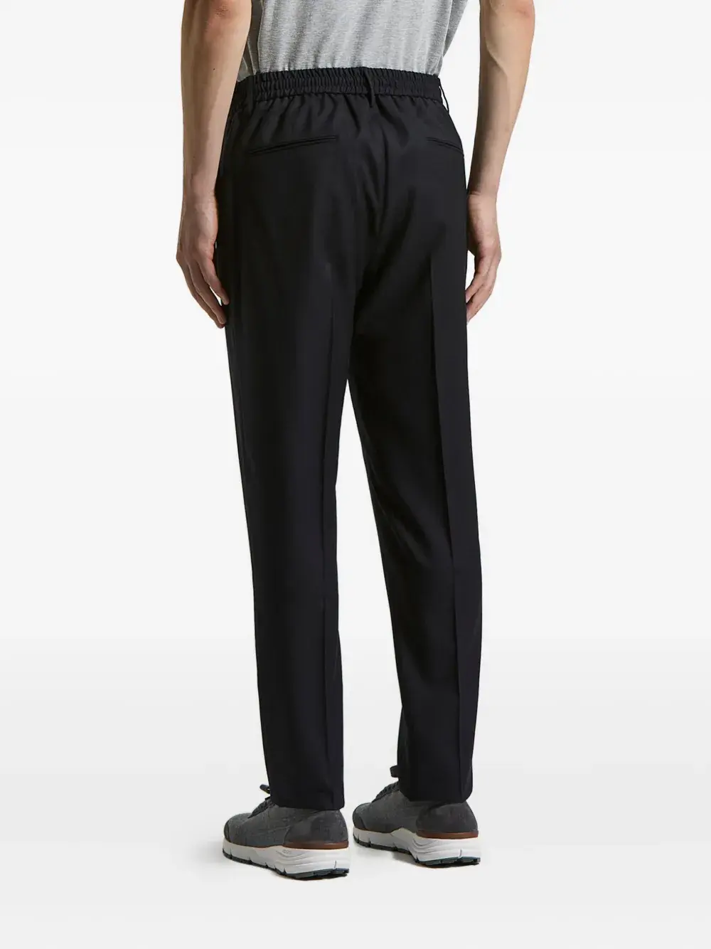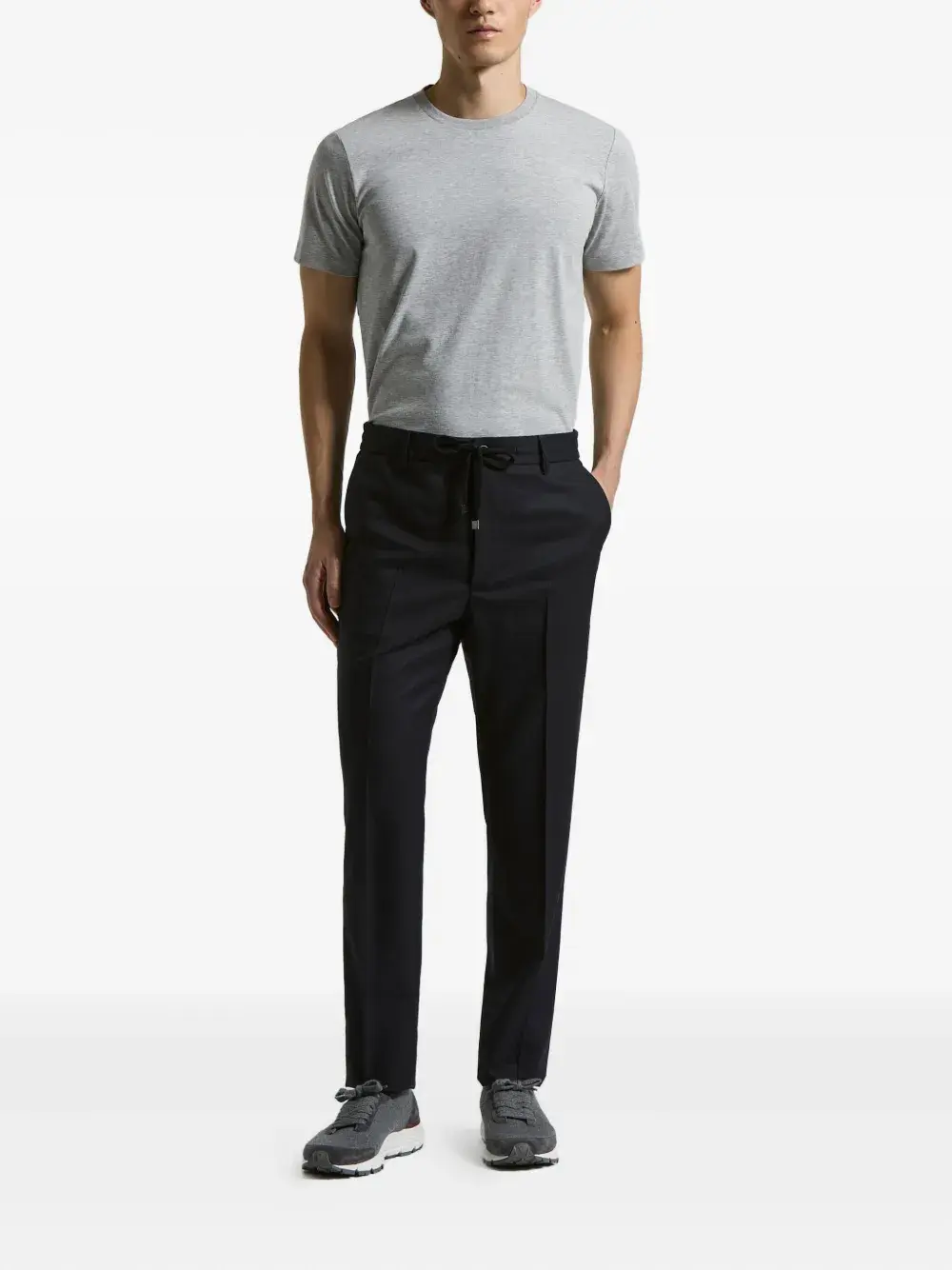 Синий цвет, эластичный пояс, застежка на кулиске, шлевки для ремня, задние прорезные карманы, карманы в боковых швах
